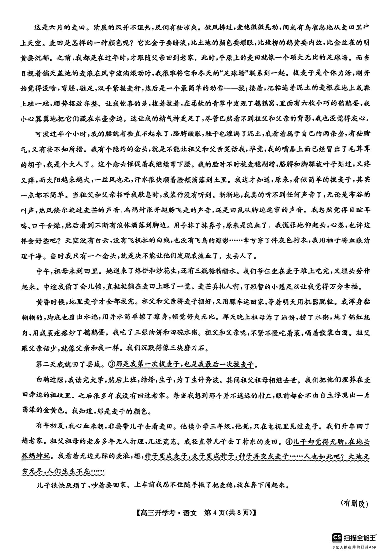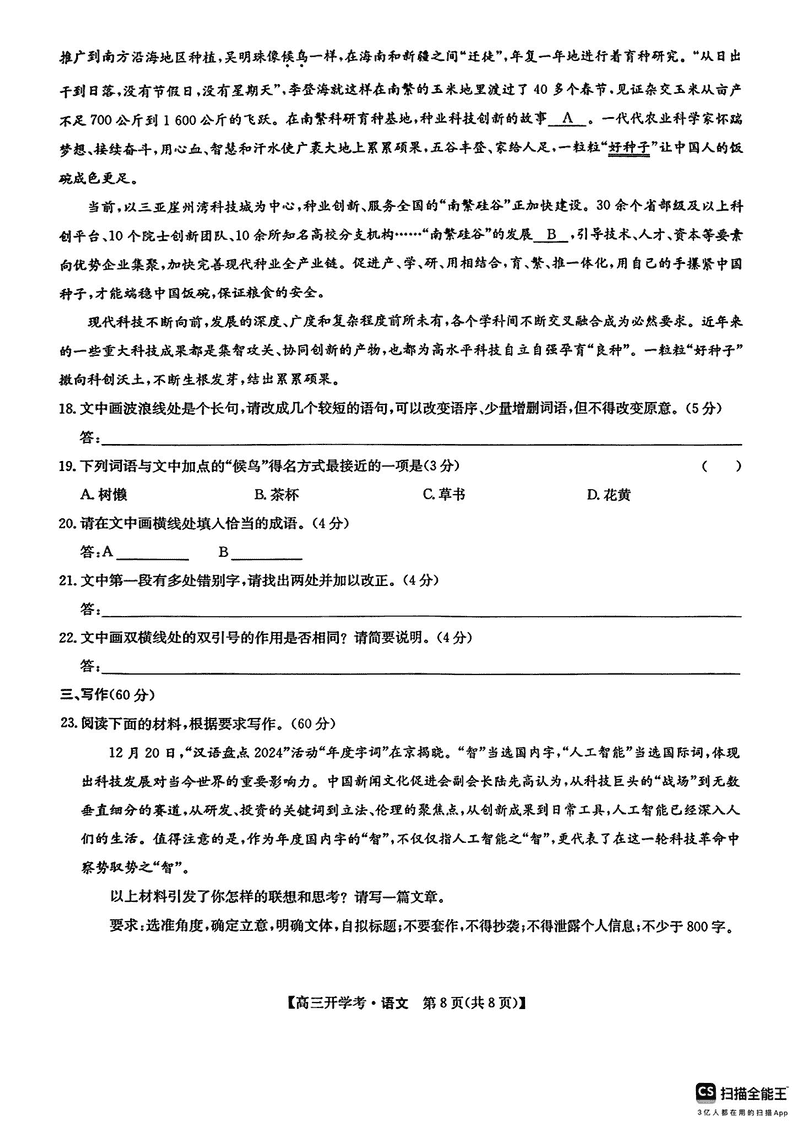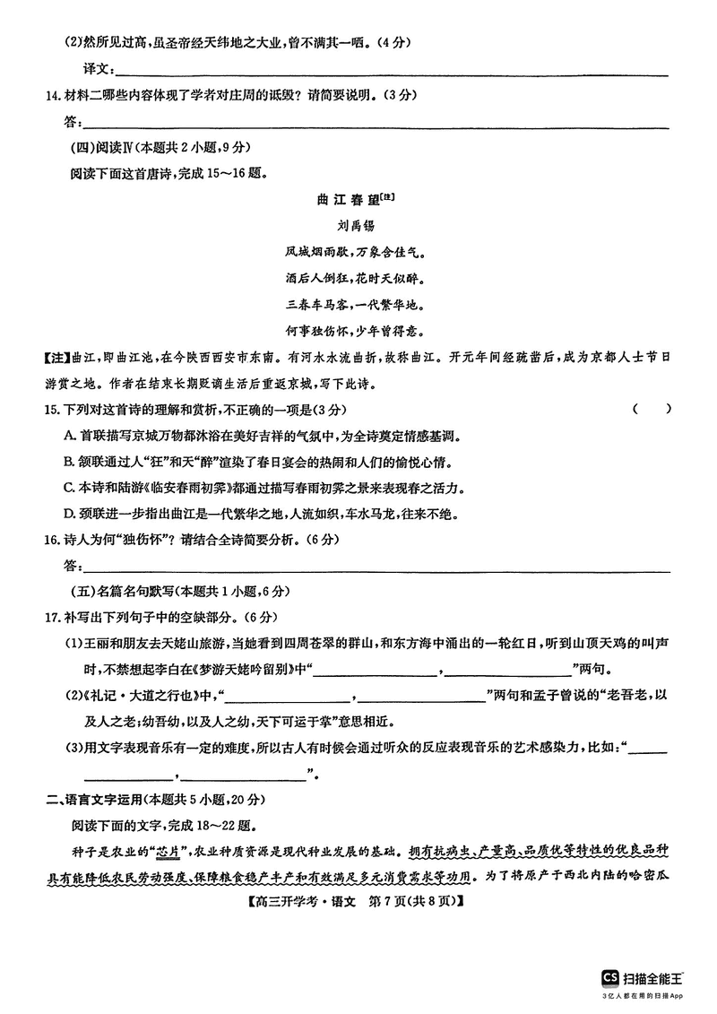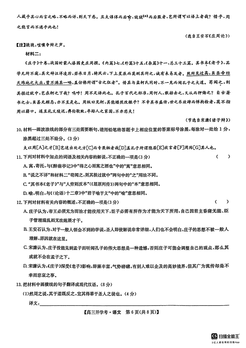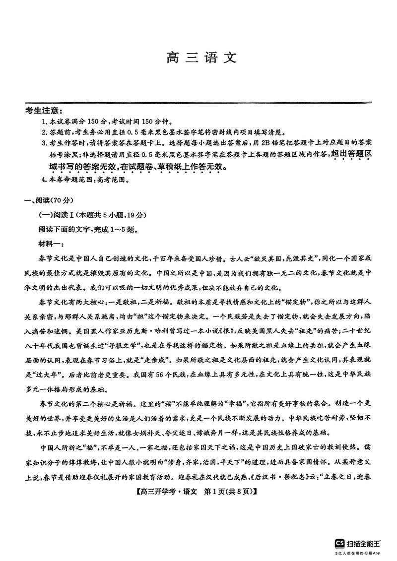 九师联盟2025届高三下学期2月开学考语文试题及答案