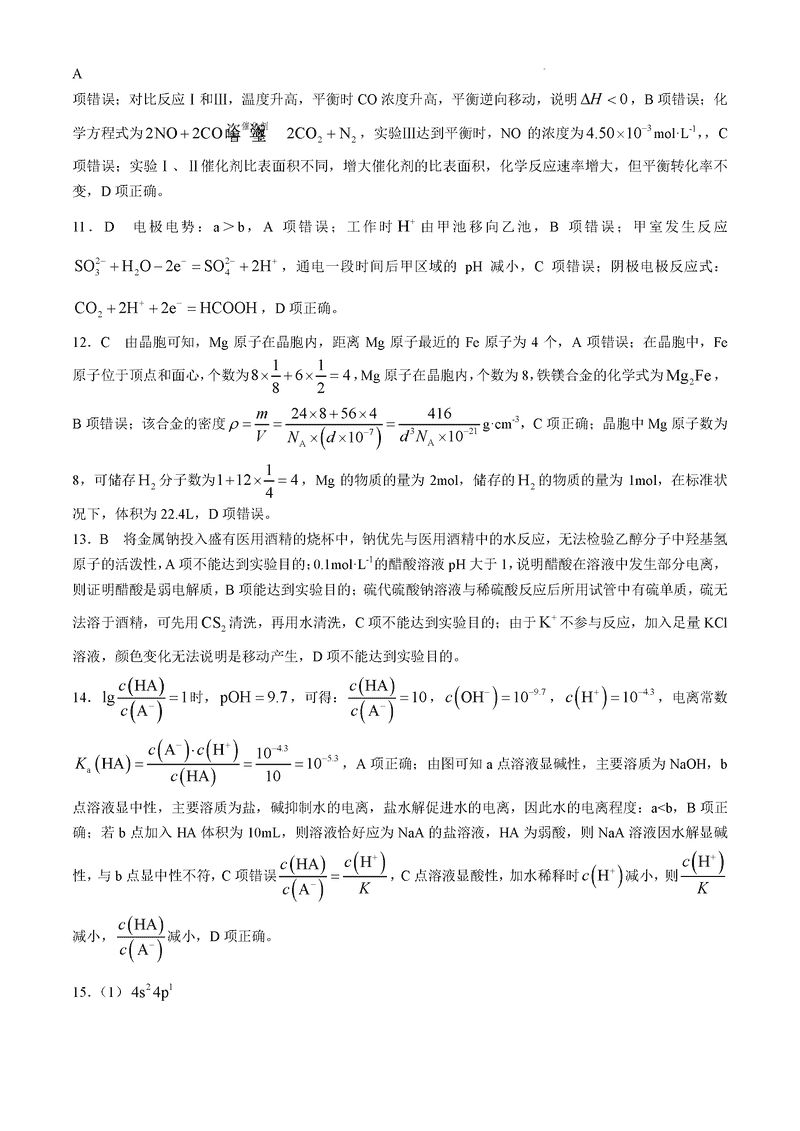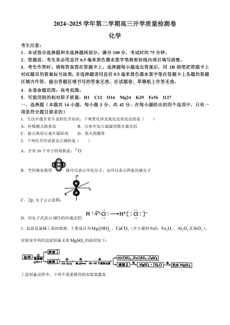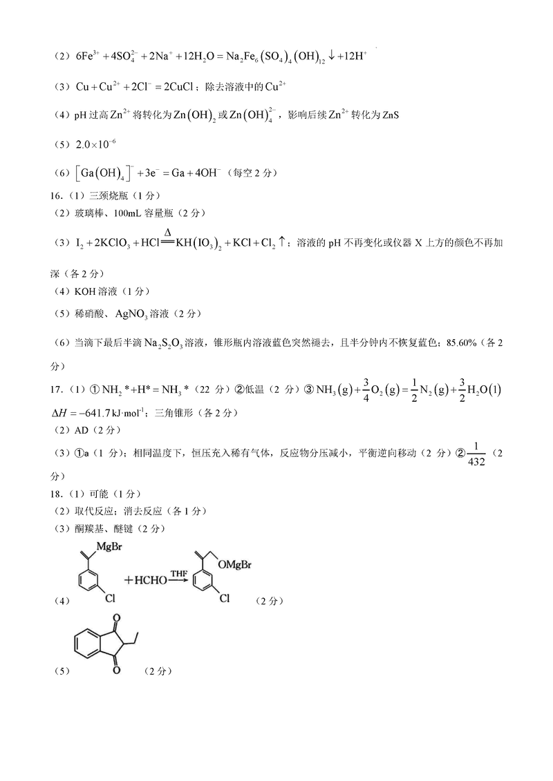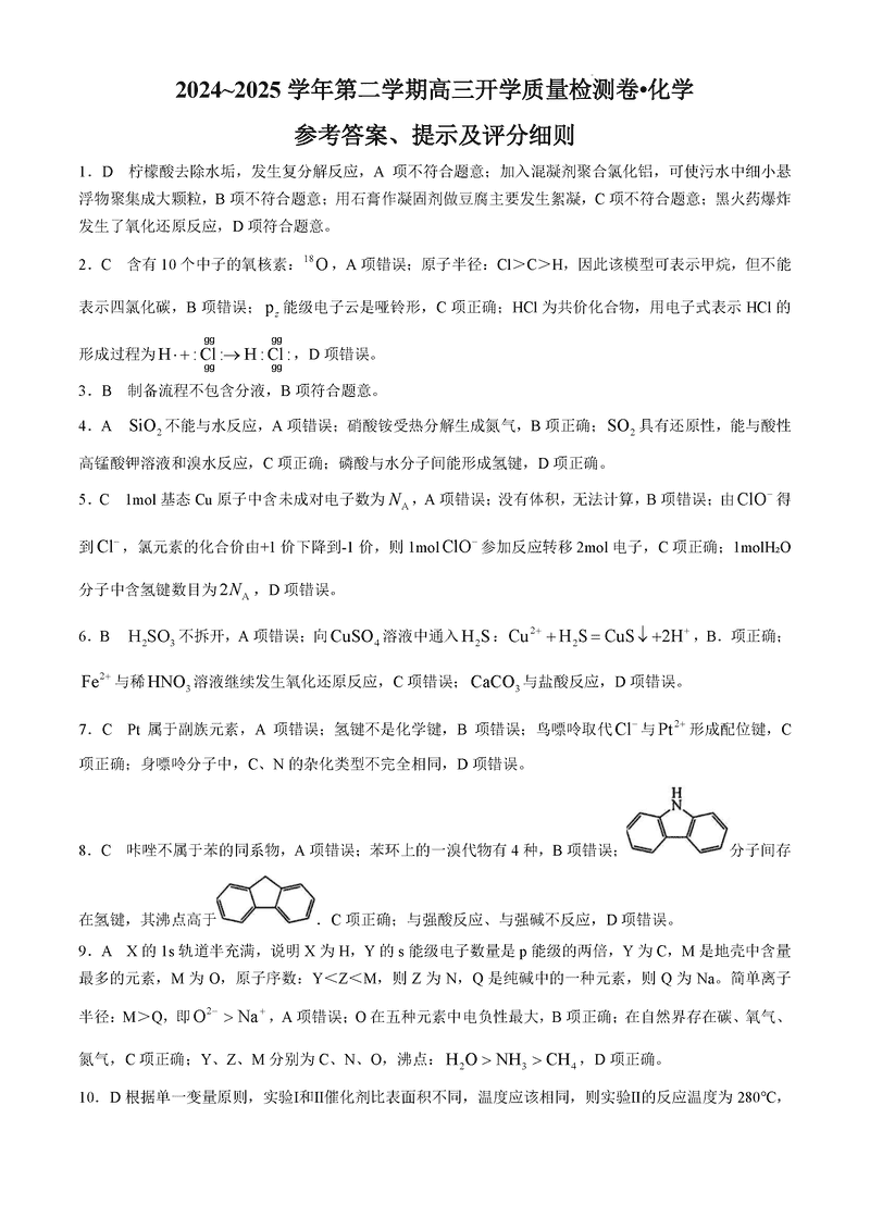 山西卓越联盟2025届高三下学期2月开学化学试题及答案