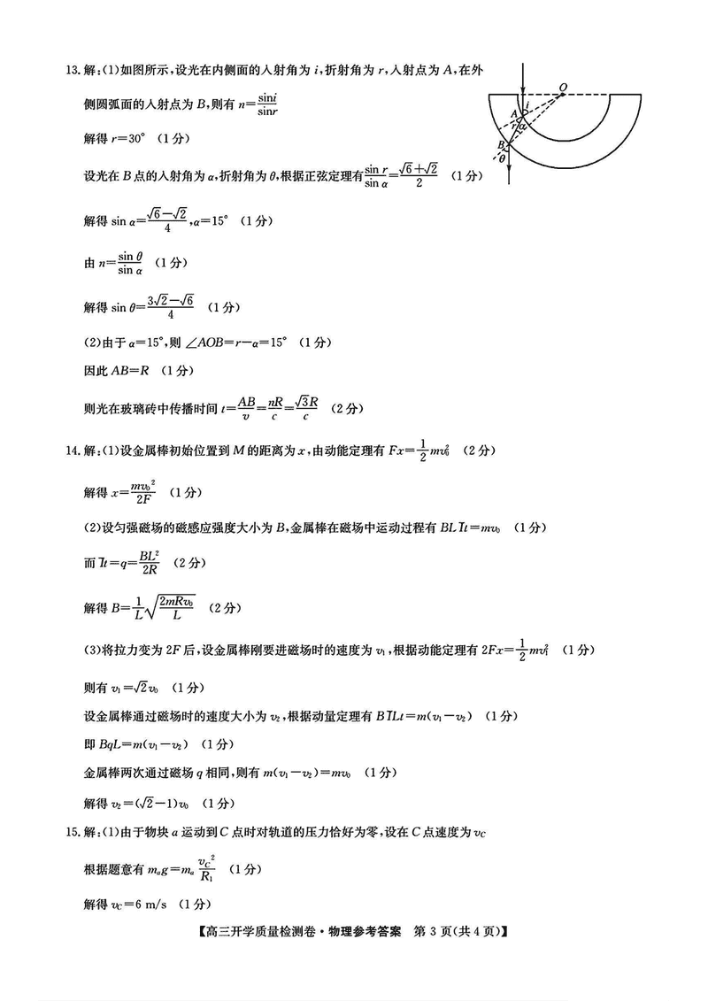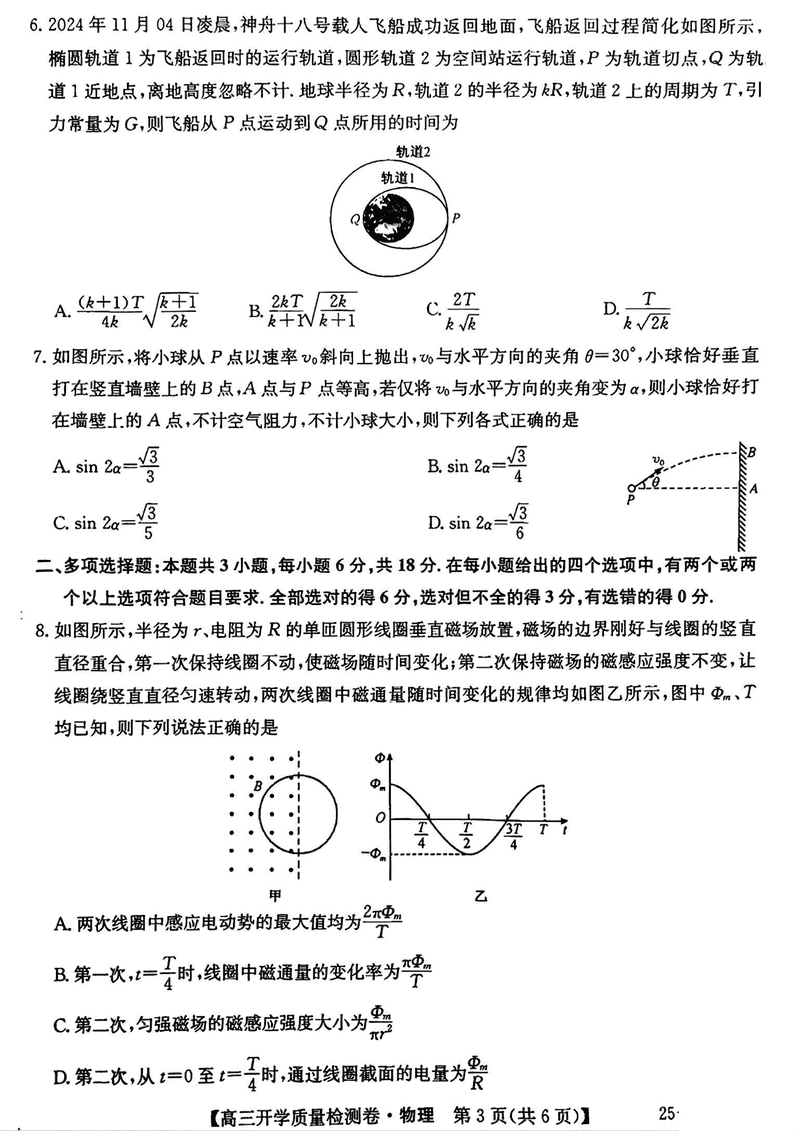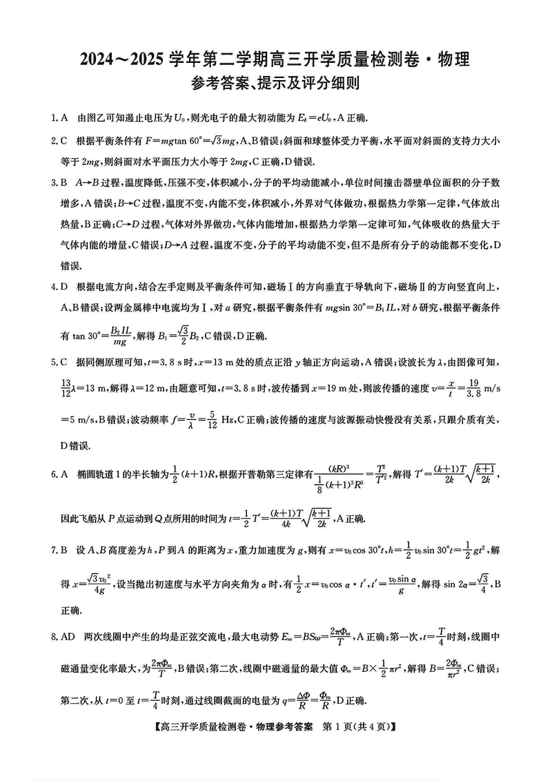 山西卓越联盟2025届高三下学期2月开学物理试题及答案