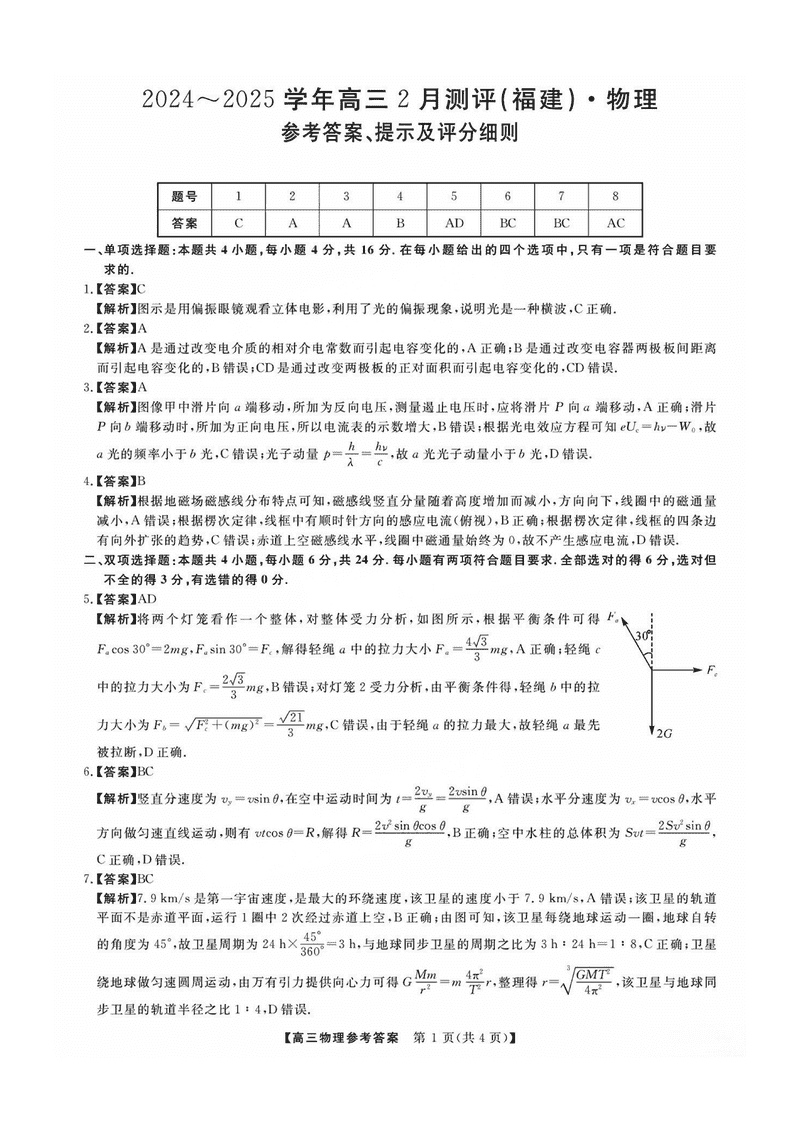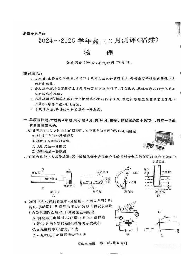 福建省金科大联考2025届高三2月开学联考物理试题及答案