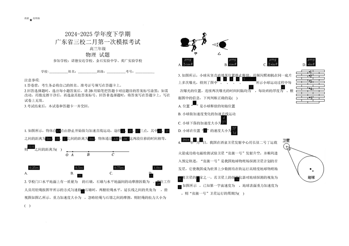 2025届广东三校高三下学期2月第一次模考物理试题及答案