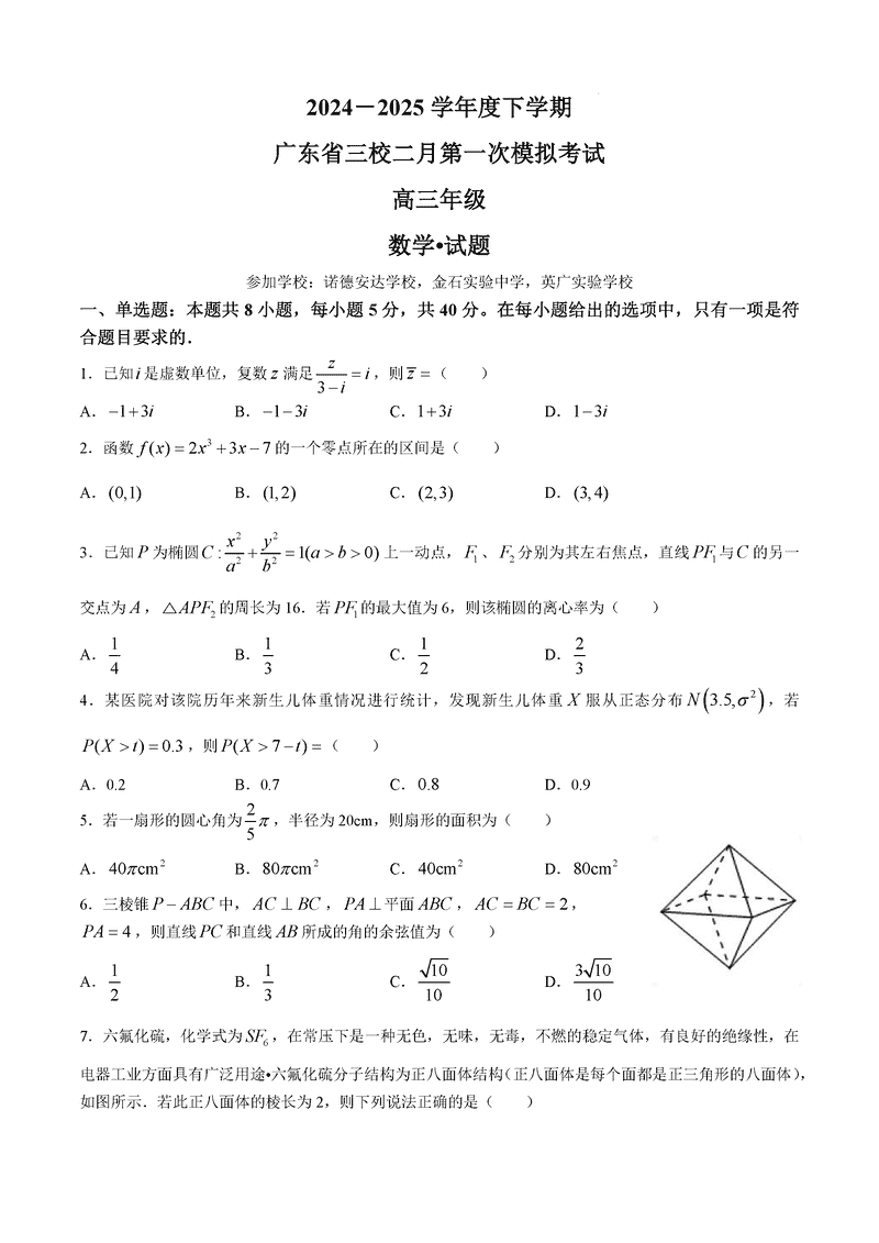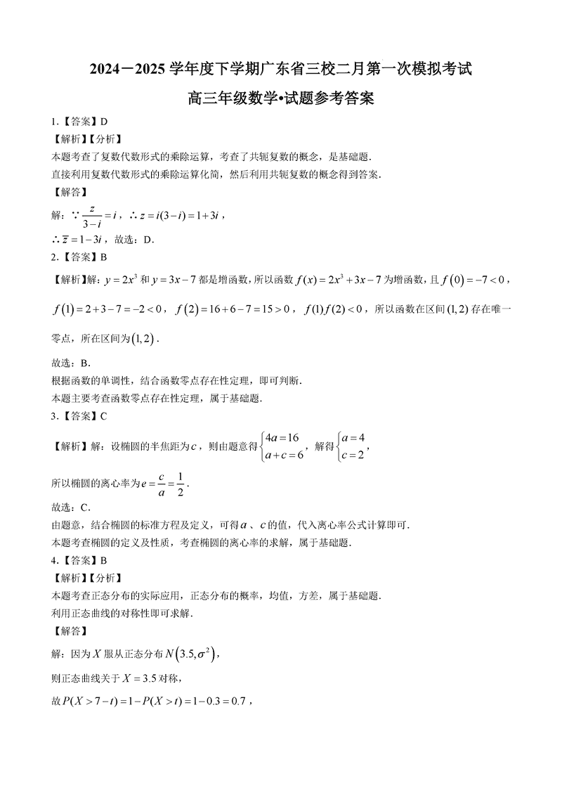 2025届广东三校高三下学期2月第一次模考数学试题及答案