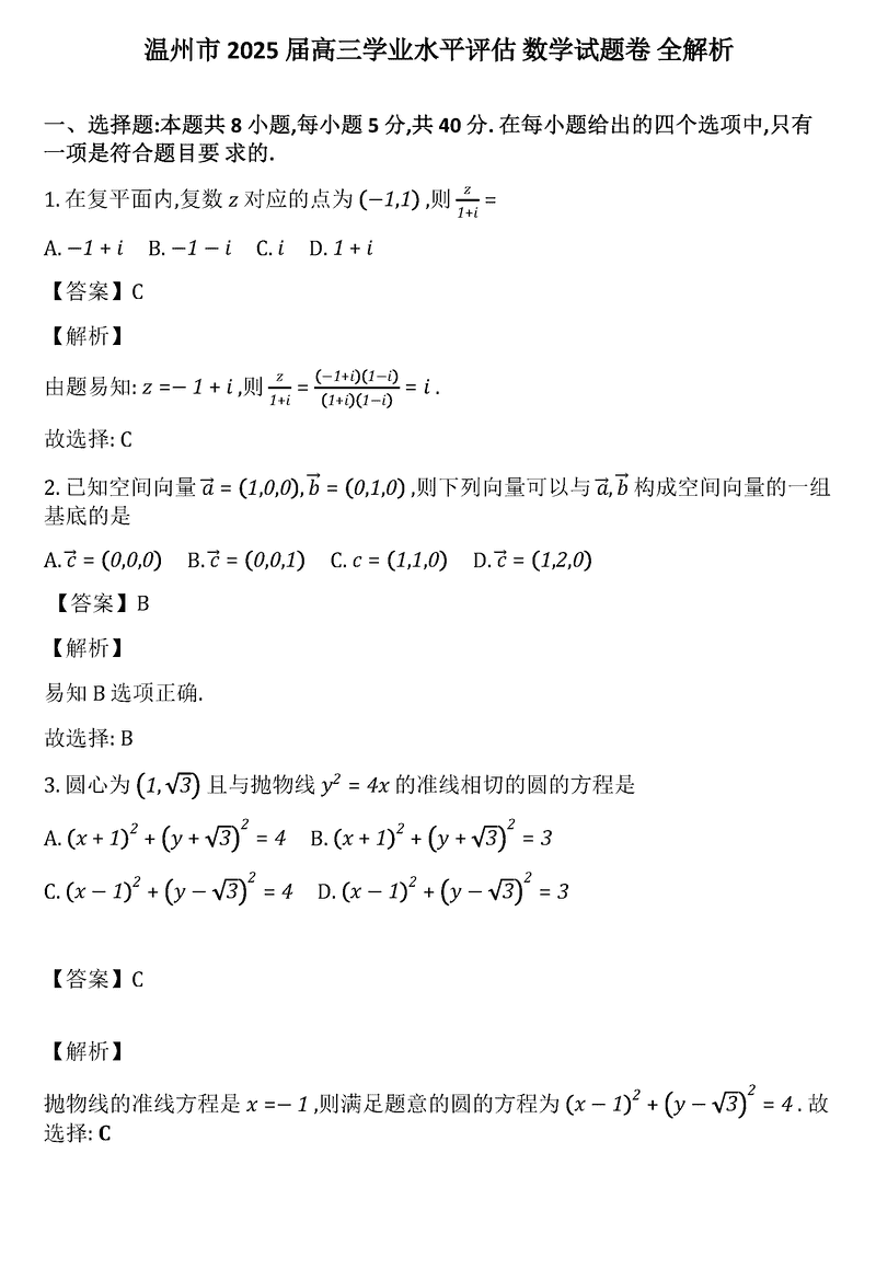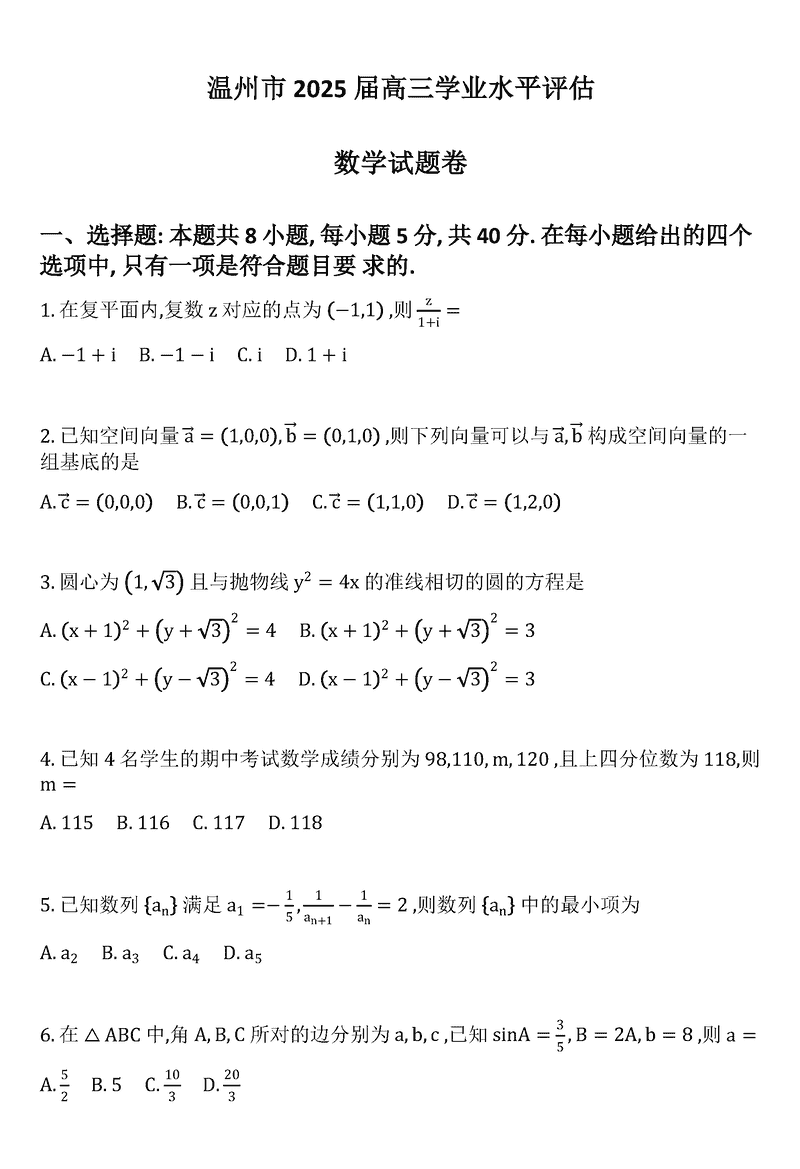 2025届浙江省温州市高三下学期学业水平评估数学考试已于近日开考,为方便考生考后及时查看考试情况,查漏补缺、弥补不足,本文整理了试题答案解析相关信息!