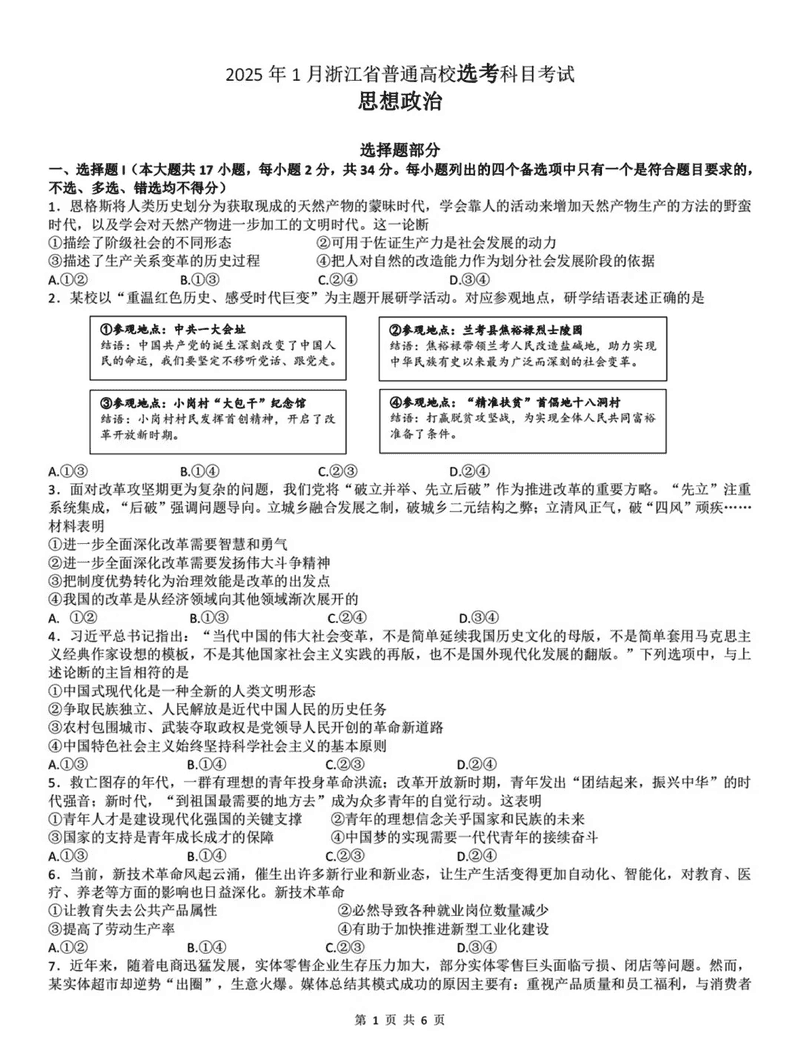 浙江首考2025年1月普通高等学校招生全国统考政治考试已于近日开考,为方便考生考后及时查看考试情况,查漏补缺、弥补不足,本文整理了试题答案解析相关信息!