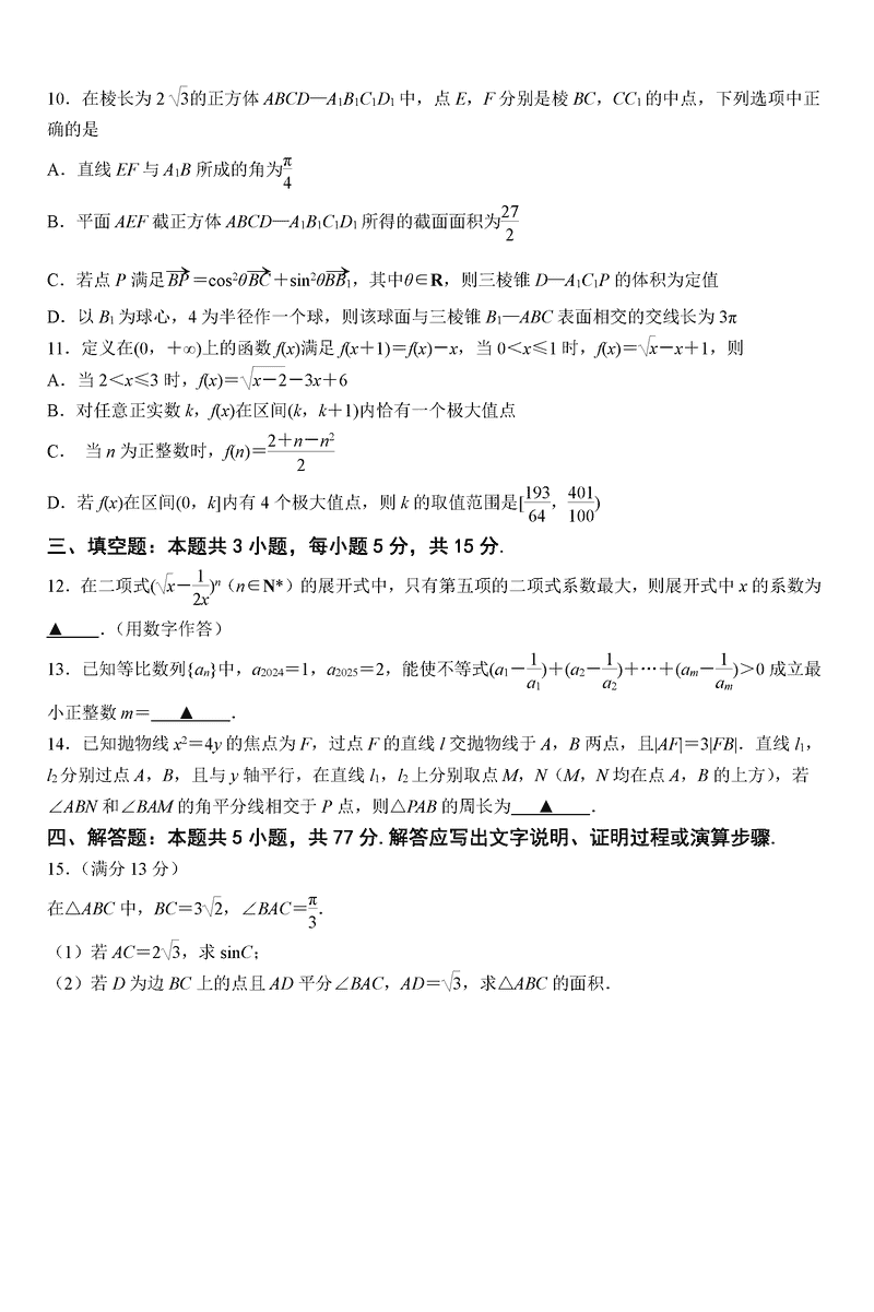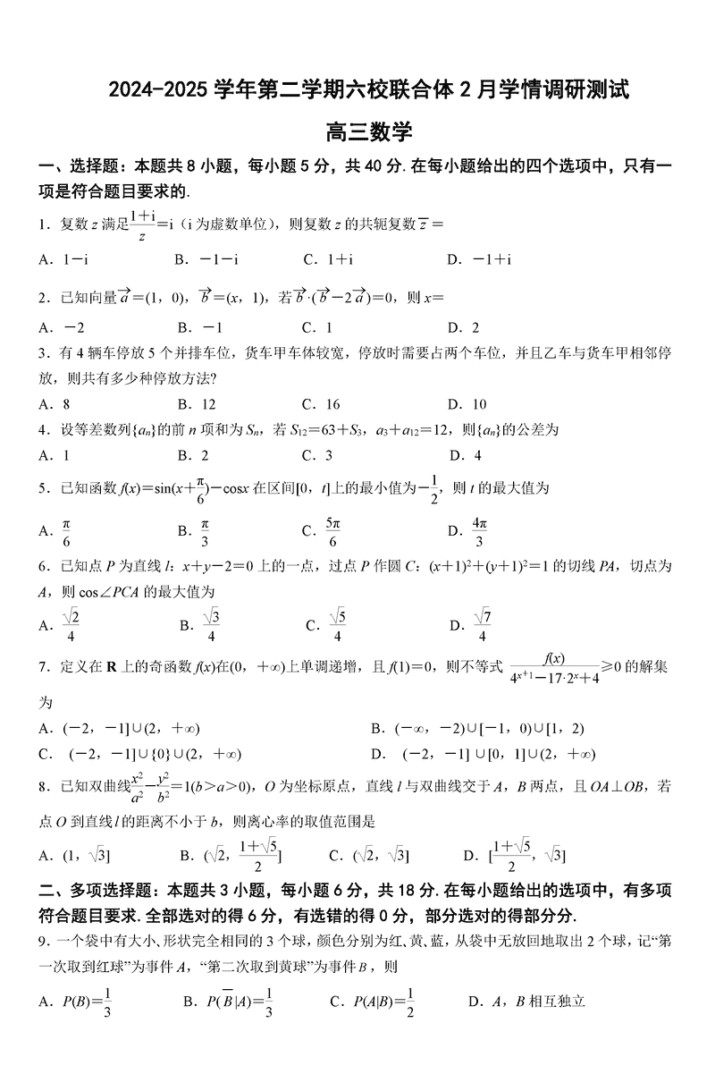 南京六校联合体2025届高三下学期2月调研数学试题及答案