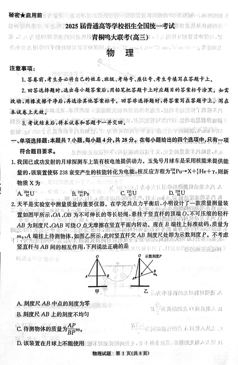 2025届河南青桐鸣高三2月联考物理试题及答案 时间:2025-02-15 河南 理综试题 2025届河南青桐鸣高三2月联考物理考试已于近日开考,为方便考生考后及时查看考试情况,查漏补缺、弥补不足,本文整理了试题答案解析相关信息! 汇总:2025届河南青桐鸣高三2月联考试题及答案汇总 物理试题及答案解析