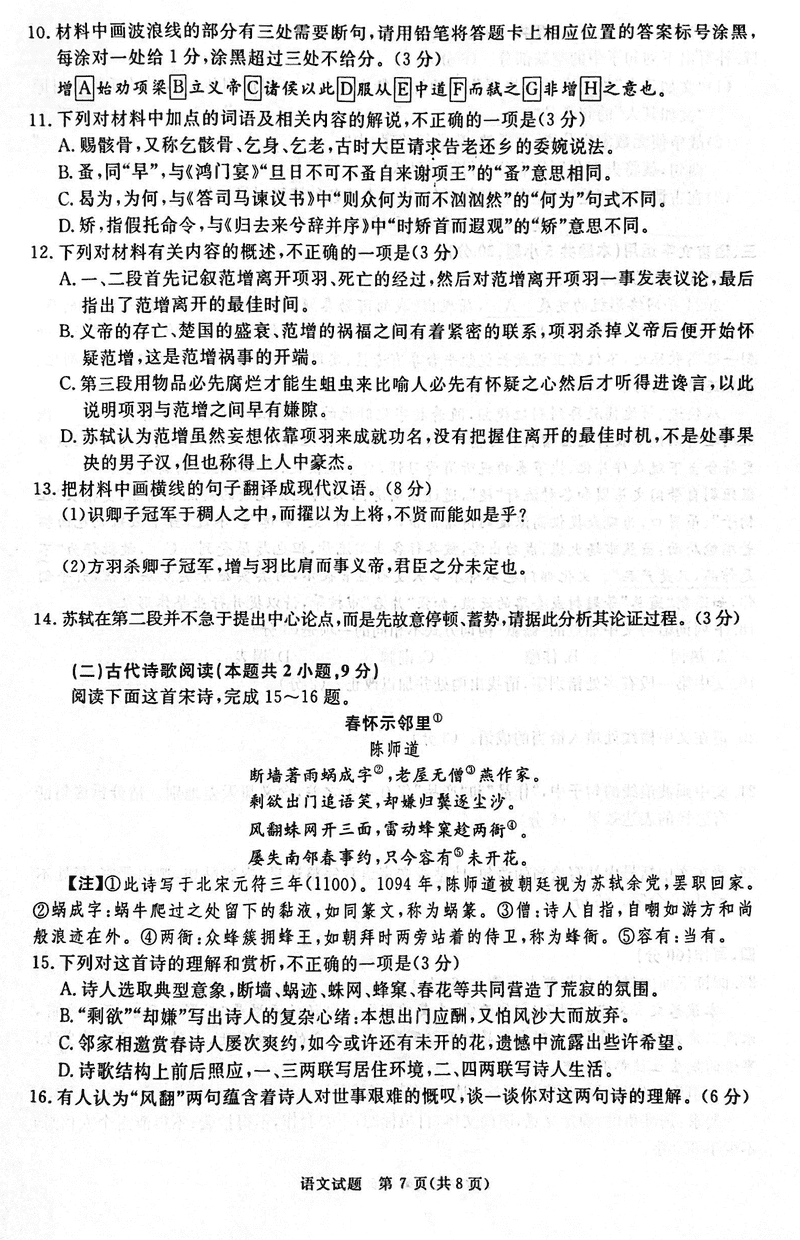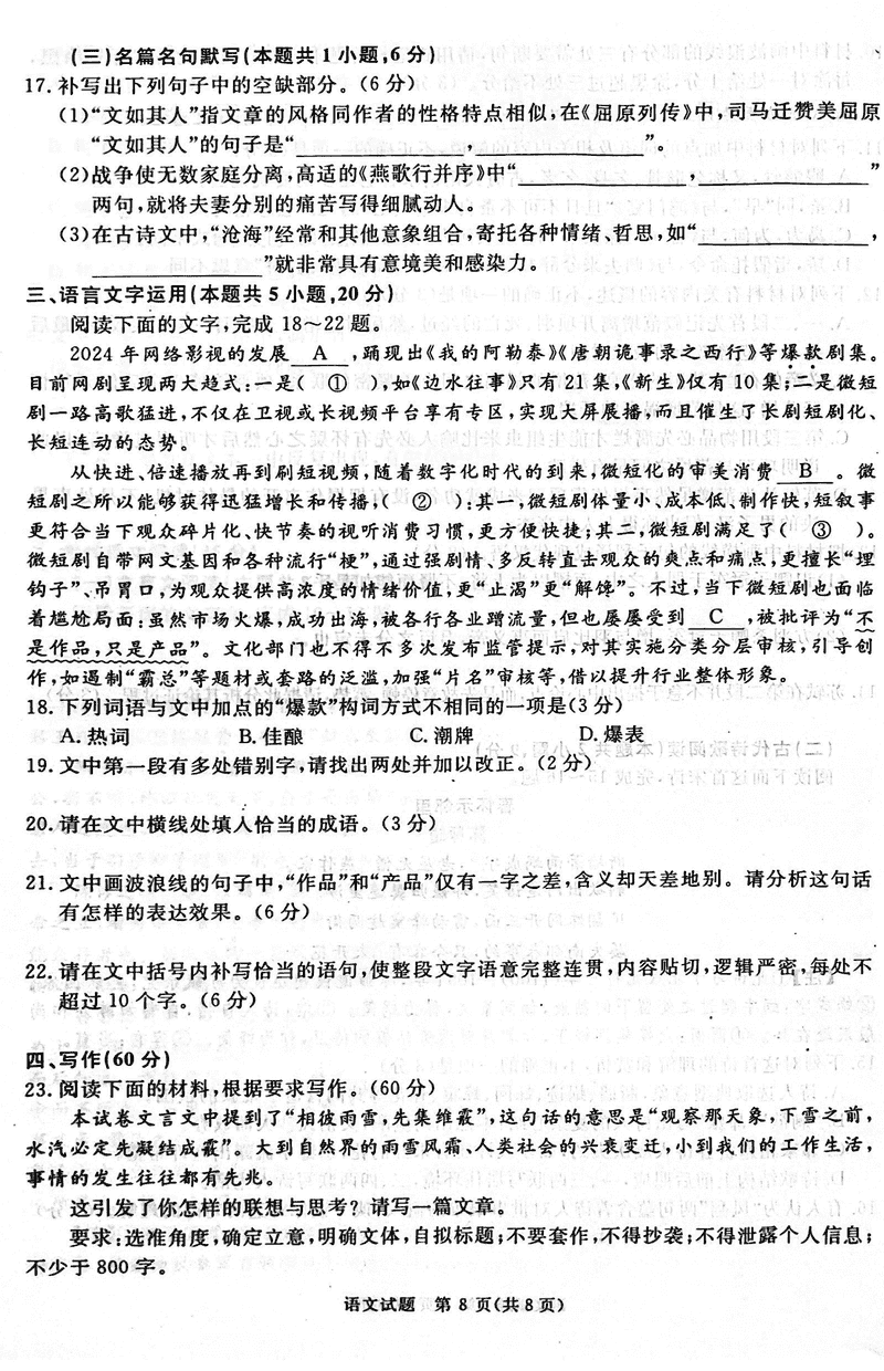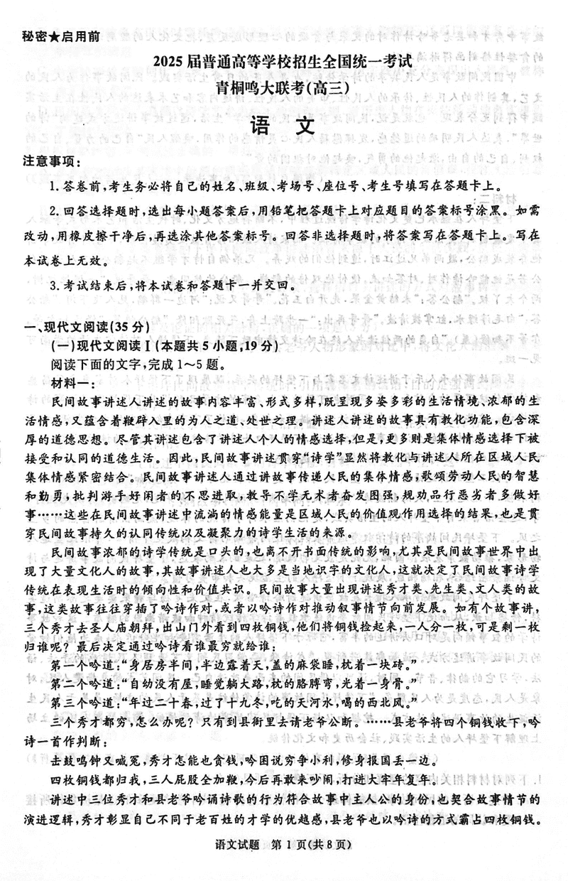2025届河南青桐鸣高三2月联考语文试题及答案 时间:2025-02-15 河南 语文试题 2025届河南青桐鸣高三2月联考语文考试已于近日开考,为方便考生考后及时查看考试情况,查漏补缺、弥补不足,本文整理了试题答案解析相关信息! 汇总:2025届河南青桐鸣高三2月联考试题及答案汇总 语文试题及答案解析