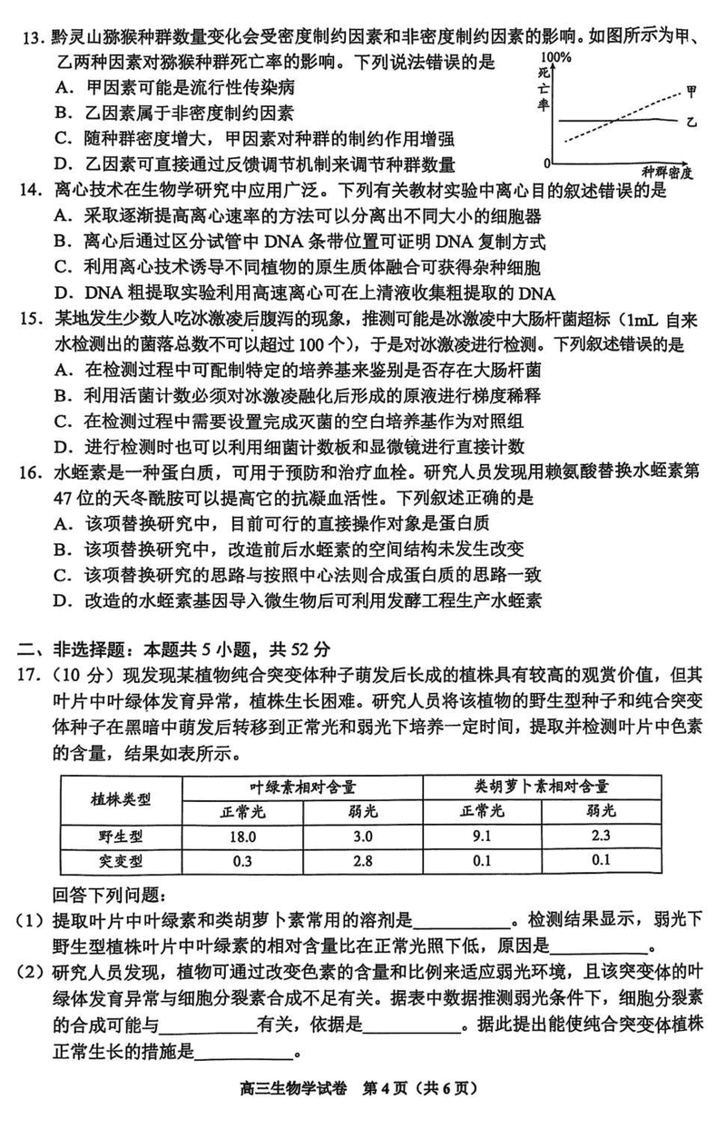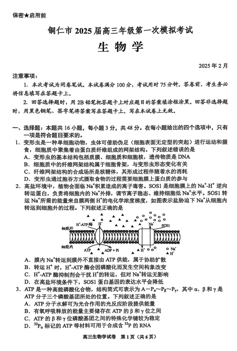 贵阳市2025年高三年级适应性考试(一)生物试题及答案
