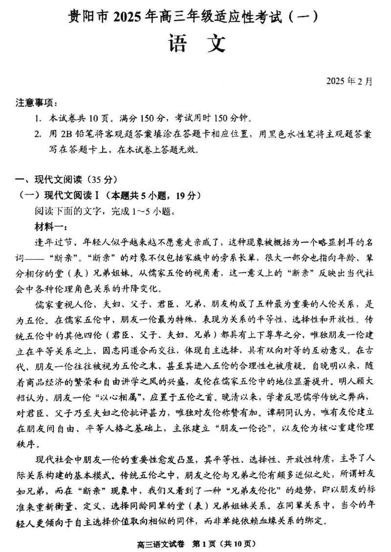 贵阳市2025年高三年级适应性考试(一)语文试题及答案
