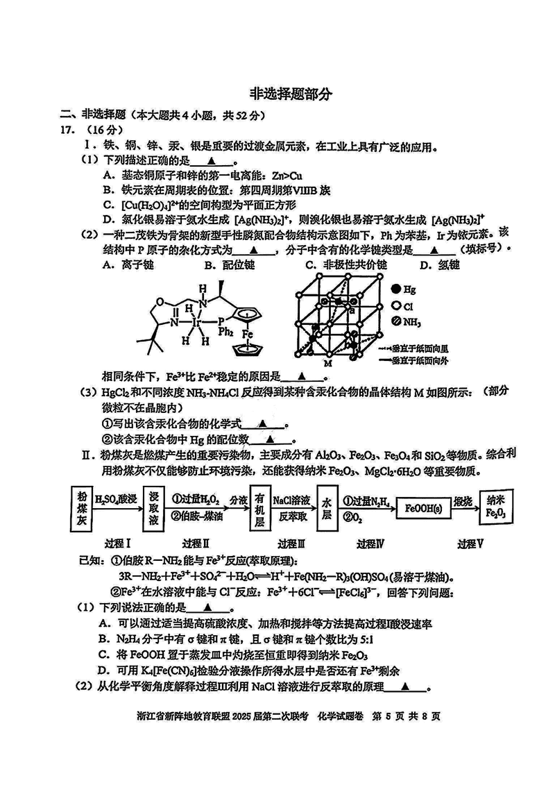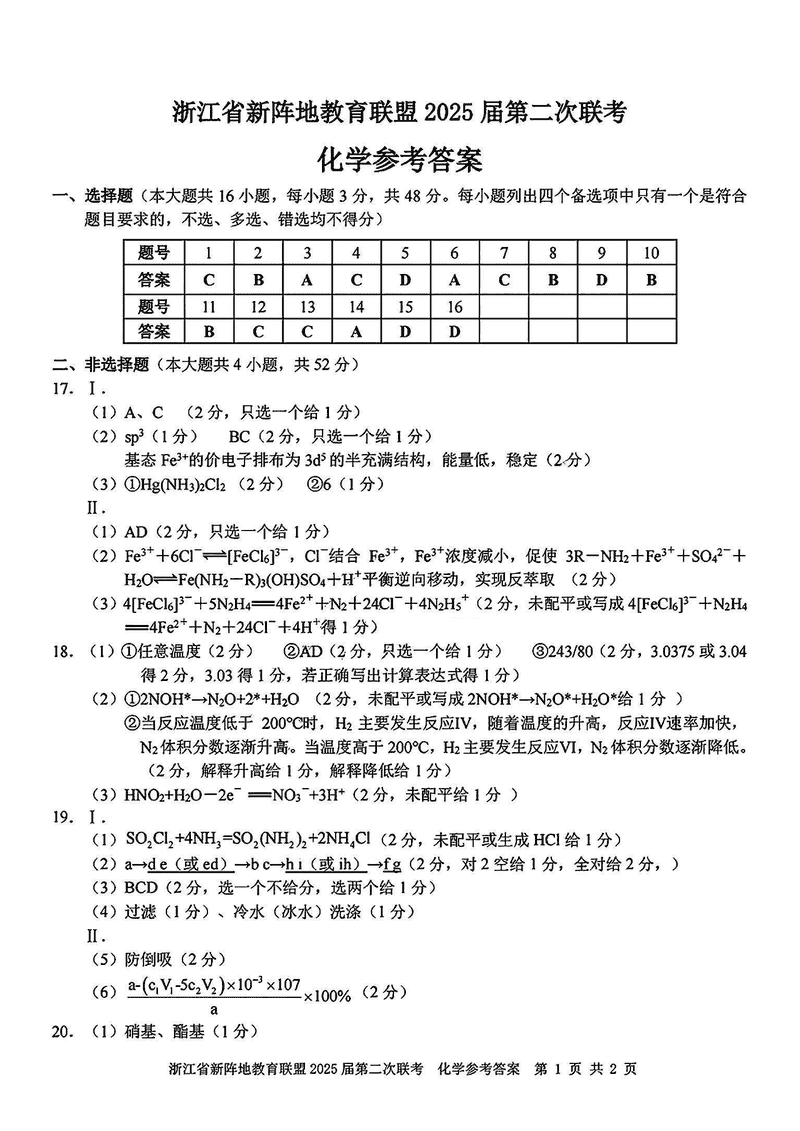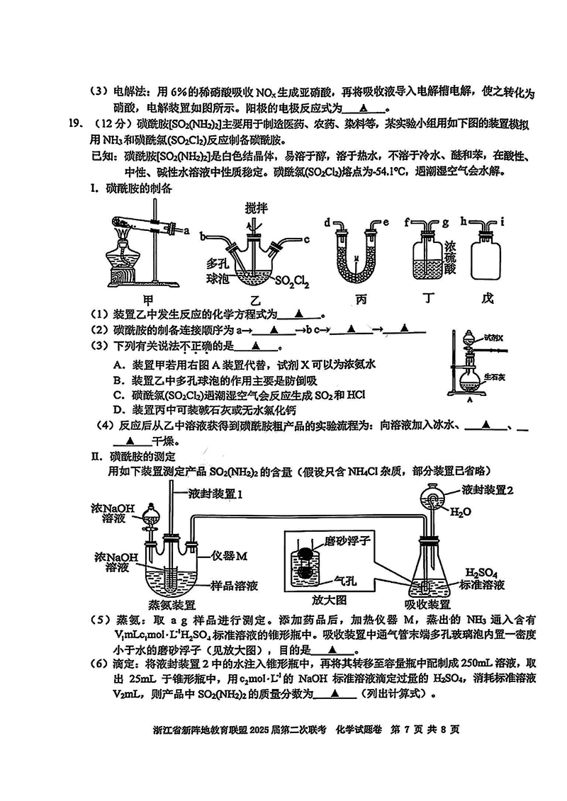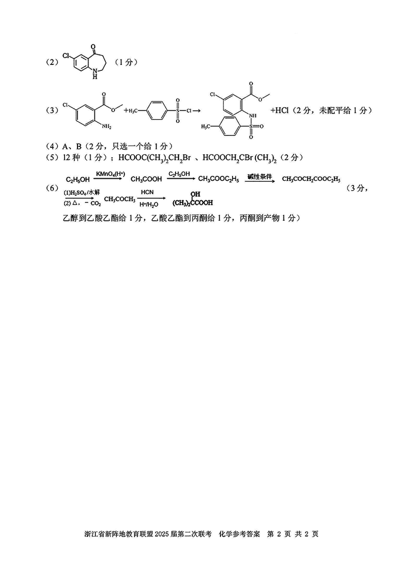 浙江新阵地教育联盟2025届高三第二次联考化学试题及答案