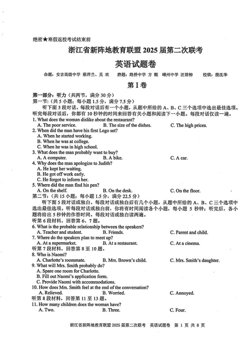 浙江新阵地教育联盟2025届高三第二次联考英语考试已于近日开考,为方便考生考后及时查看考试情况,查漏补缺、弥补不足,本文整理了试题答案解析相关信息!
