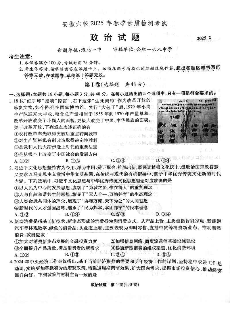 安徽六校2025年高三2月春季素质检测政治考试已于近日开考,为方便考生考后及时查看考试情况,查漏补缺、弥补不足,本文整理了试题答案解析相关信息!