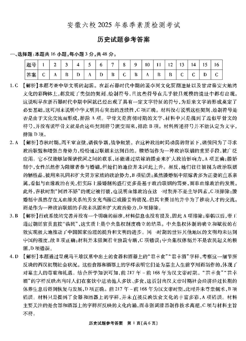 安徽六校2025年高三2月春季素质检测历史考试已于近日开考,为方便考生考后及时查看考试情况,查漏补缺、弥补不足,本文整理了试题答案解析相关信息!