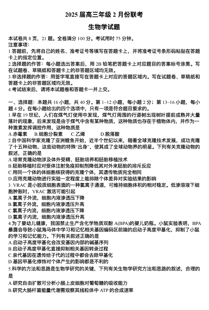 2025届广东省衡水金卷高三2月大联考生物试题及答案 时间:2025-02-17 广东 理综试题 2025届广东省衡水金卷高三2月大联考生物考试已于近日开考,为方便考生考后及时查看考试情况,查漏补缺、弥补不足,本文整理了试题答案解析相关信息! 汇总:2025届广东省衡水金卷高三2月大联考试题及答案汇总 生物试题及答案解析