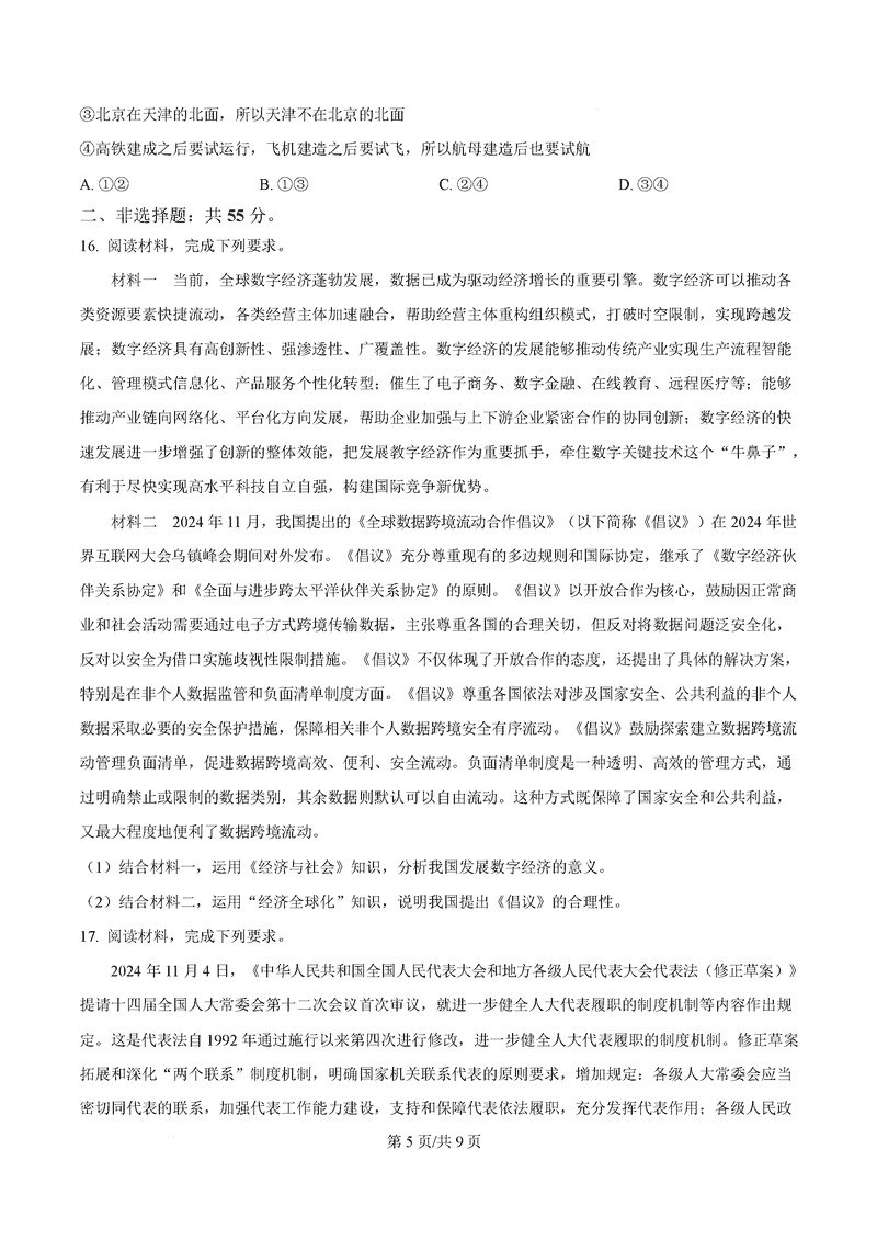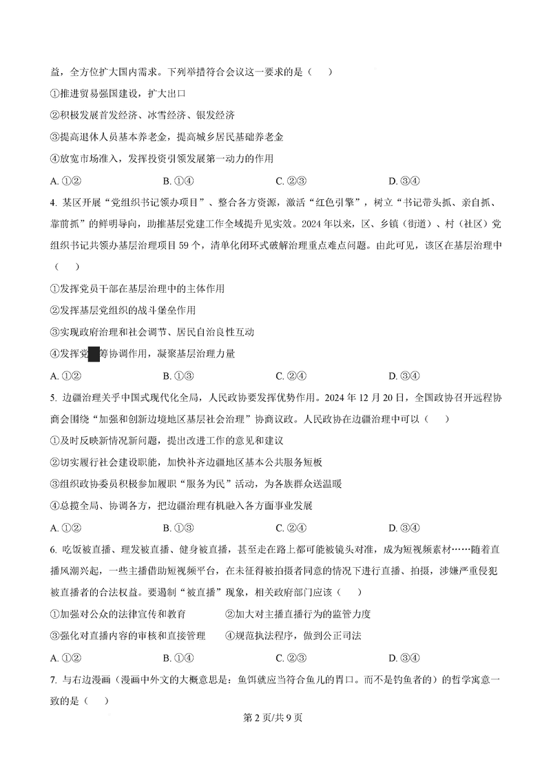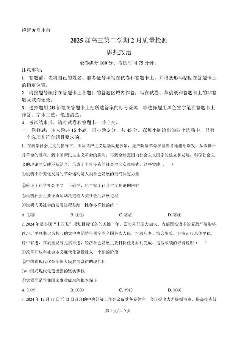 2025届金科大联考高三下学期2月质量检测政治试题及答案