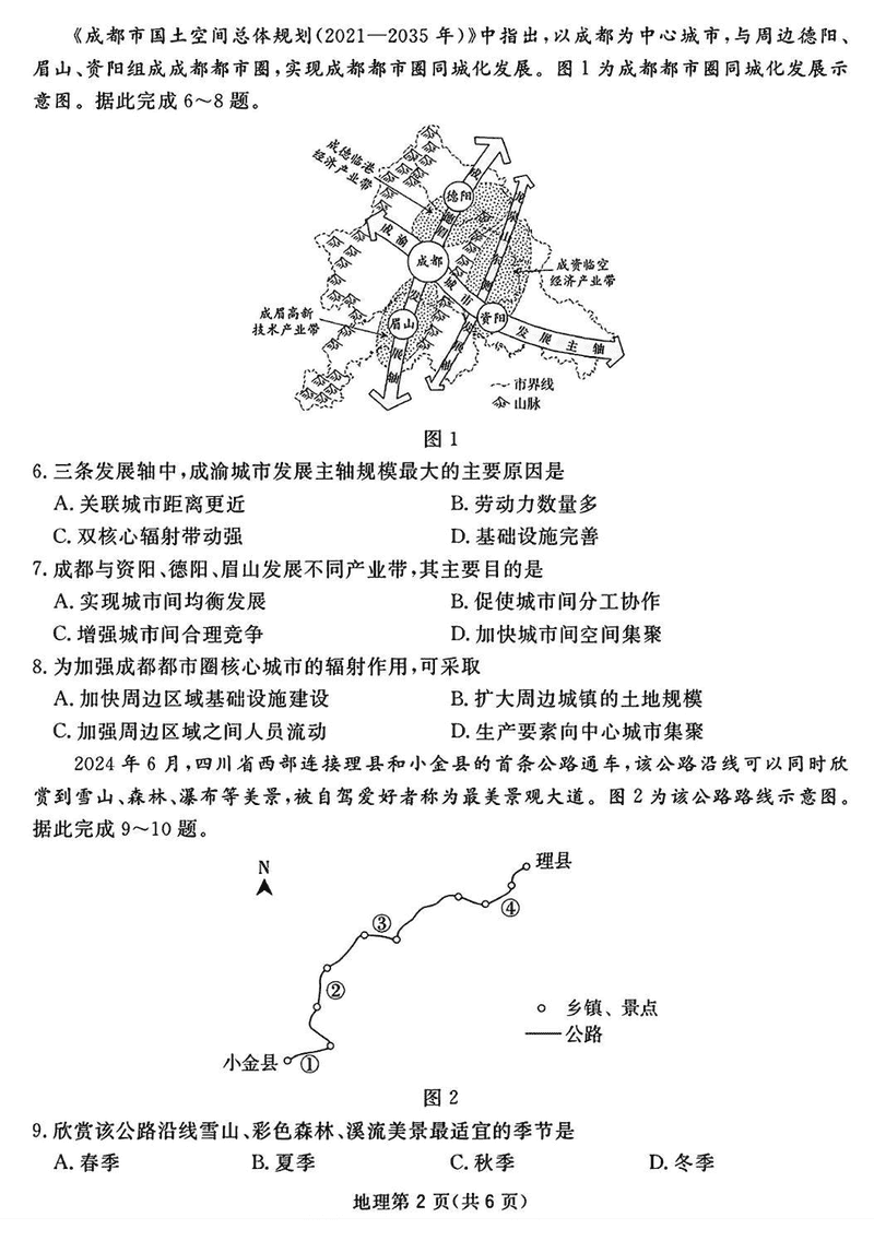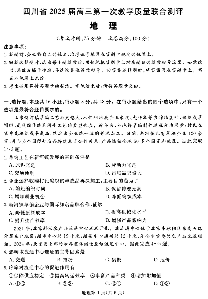 四川省2025届高三下学期第一次教学质量联合测评地理试题及答案