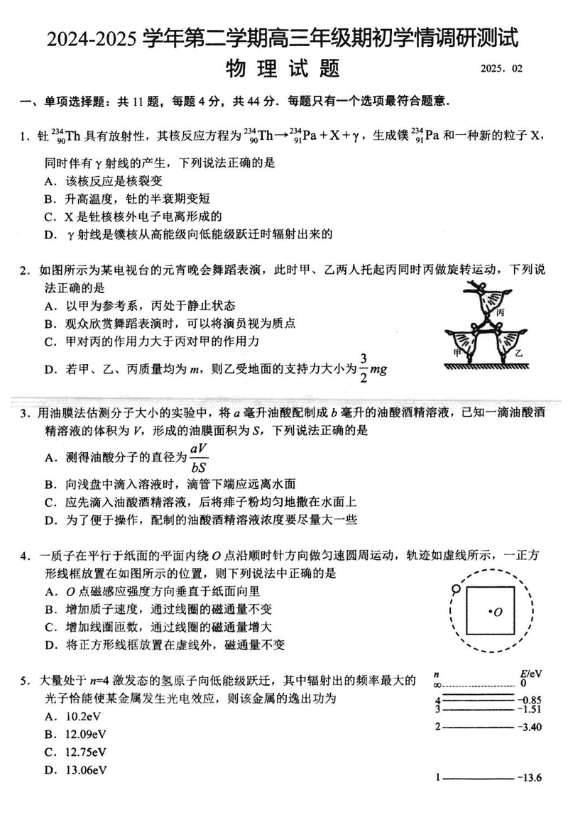 扬州高邮2025年高三下学期期初学情调研物理试题及答案