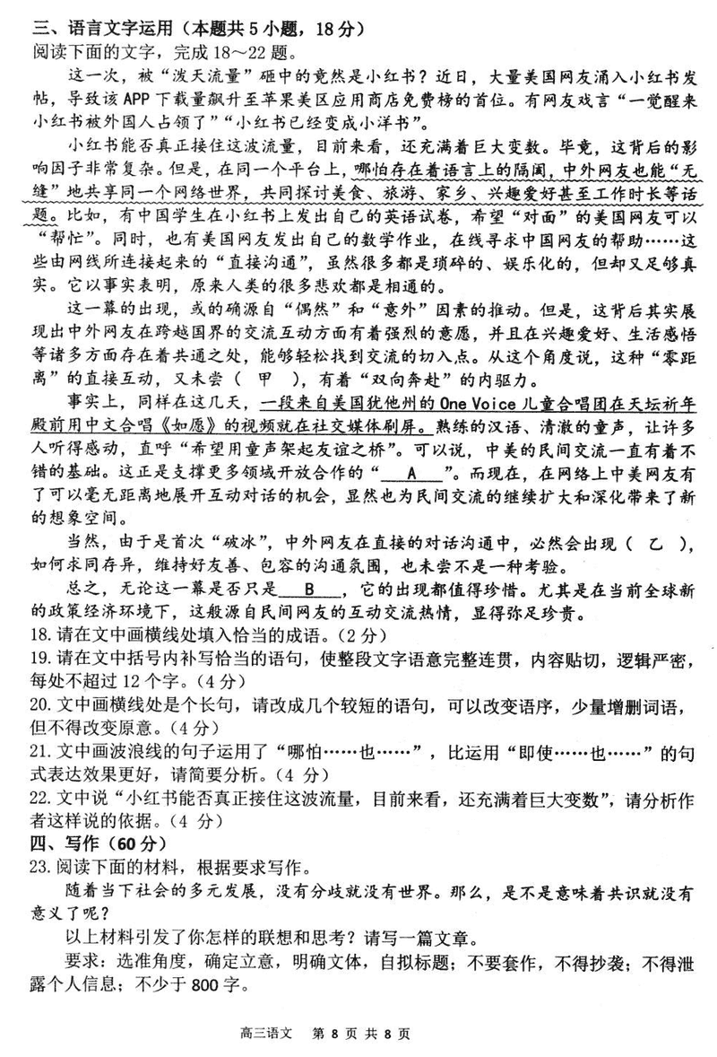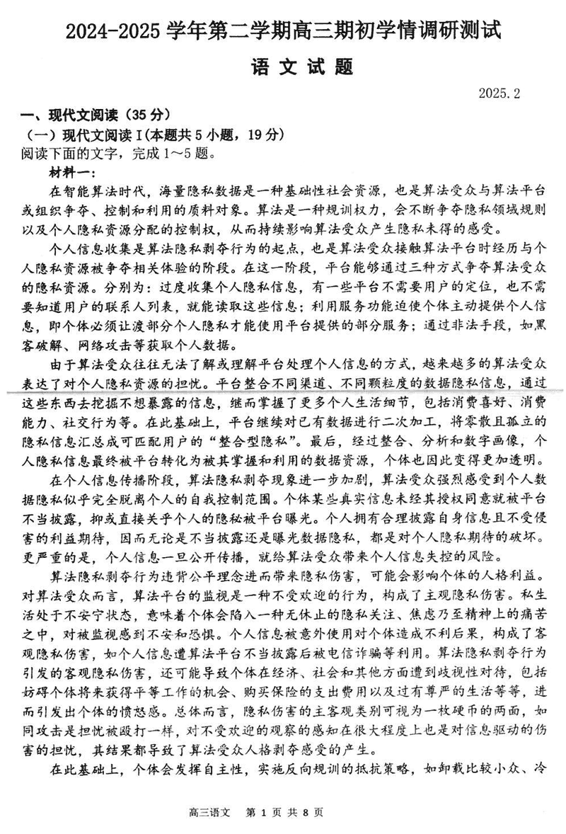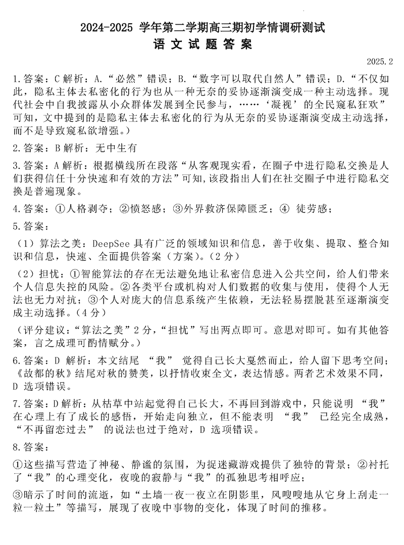 扬州高邮2025年高三下学期期初学情调研语文试题及答案 时间:2025-02-20 江苏 语文试题 扬州高邮2025年高三下学期期初学情调研语文考试已于近日开考,为方便考生考后及时查看考试情况,查漏补缺、弥补不足,本文整理了试题答案解析相关信息! 汇总:扬州高邮2025年高三下学期开学考试题及答案汇总 语文试题及答案解析