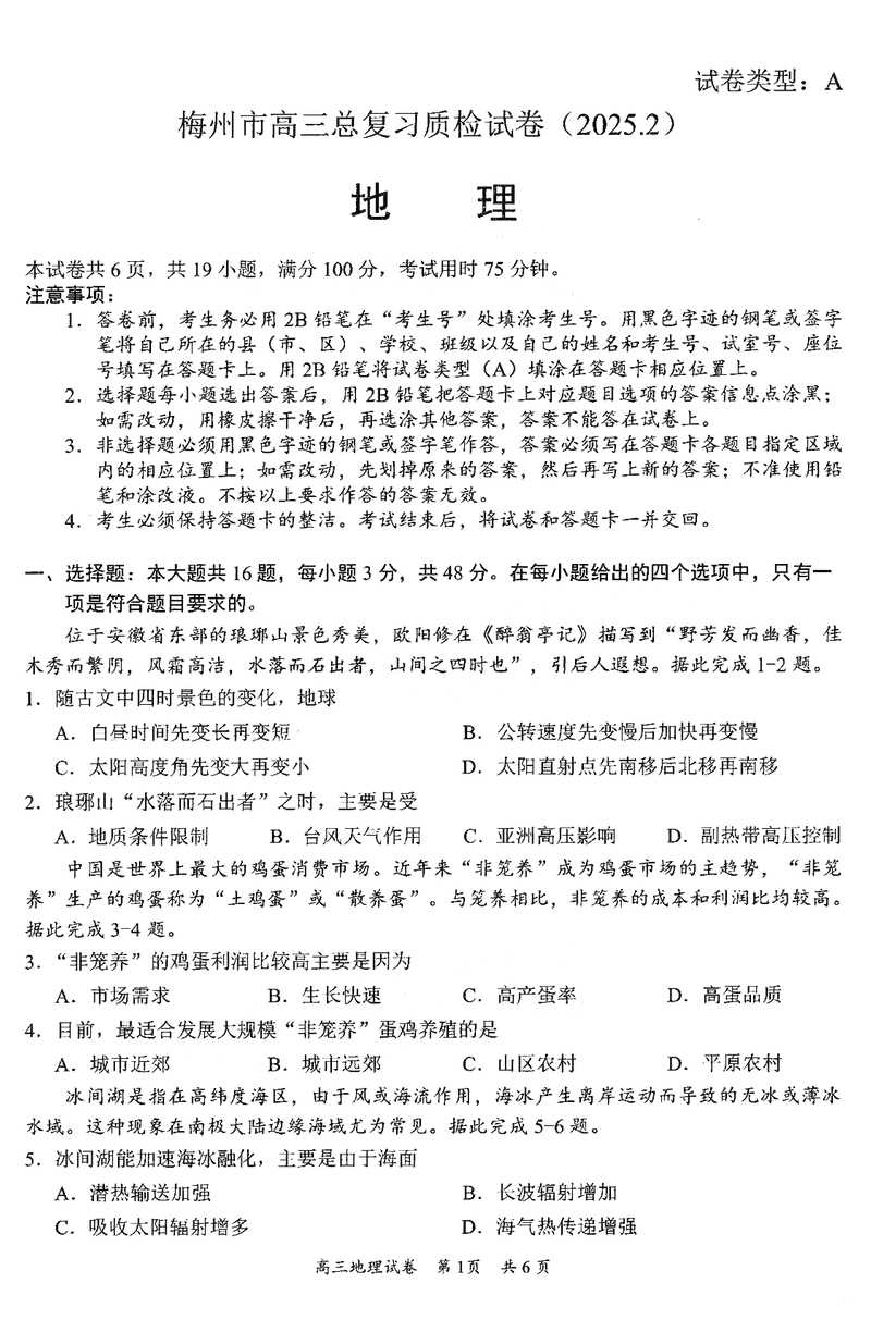 广东梅州一模2025届高三下学期模拟预测(一)地理考试已于近日开考,为方便考生考后及时查看考试情况,查漏补缺、弥补不足,本文整理了试题答案解析相关信息!