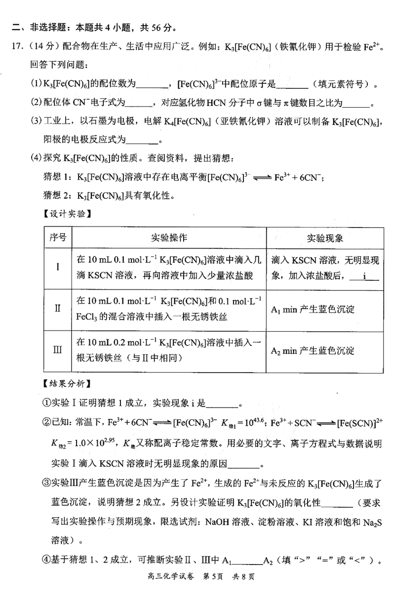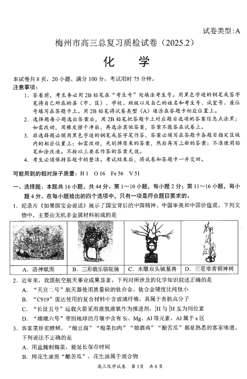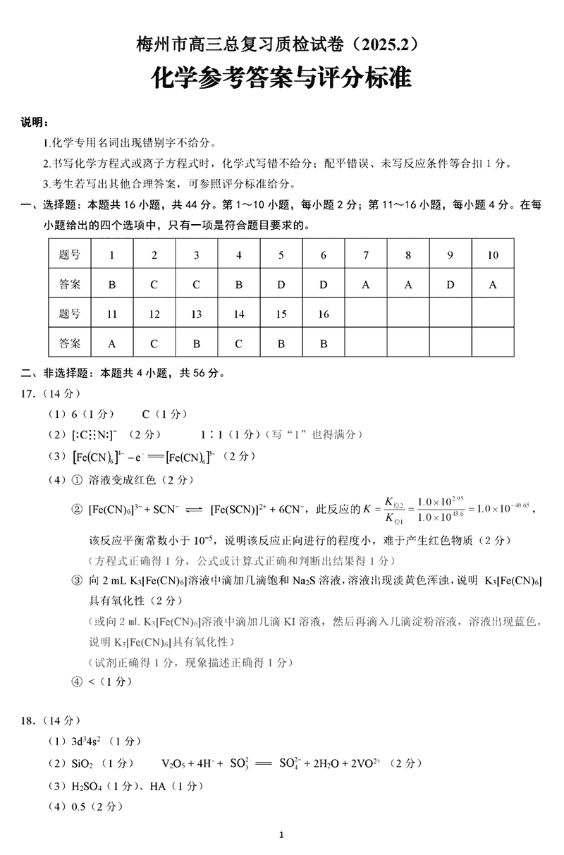 广东梅州一模2025届高三下学期模拟预测(一)化学考试已于近日开考,为方便考生考后及时查看考试情况,查漏补缺、弥补不足,本文整理了试题答案解析相关信息!