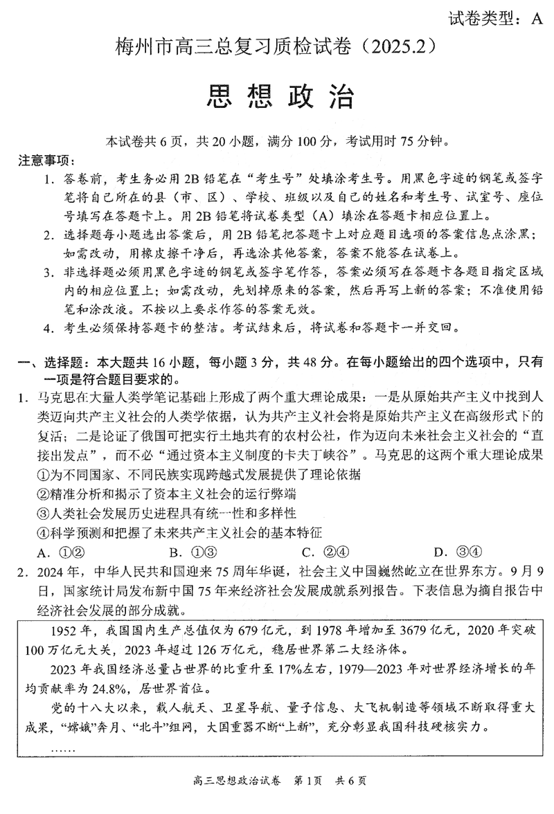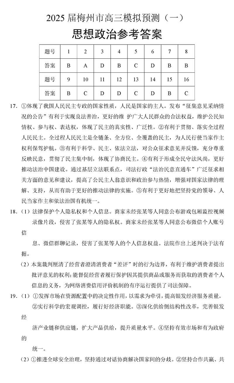 广东梅州一模2025届高三下学期模拟预测(一)政治考试已于近日开考,为方便考生考后及时查看考试情况,查漏补缺、弥补不足,本文整理了试题答案解析相关信息!