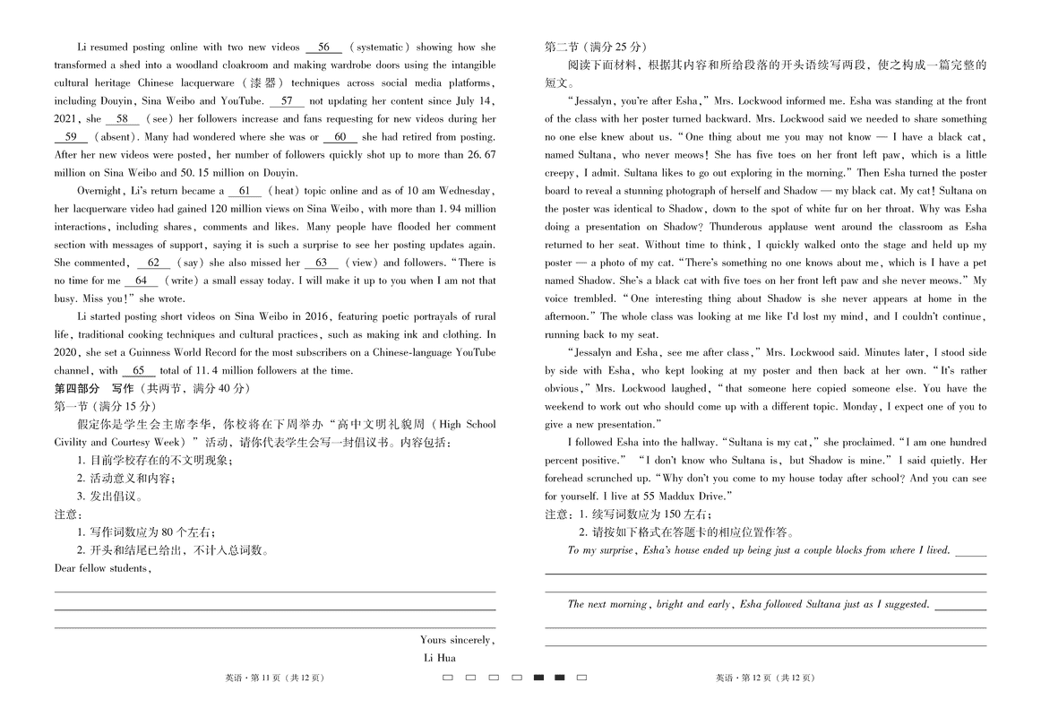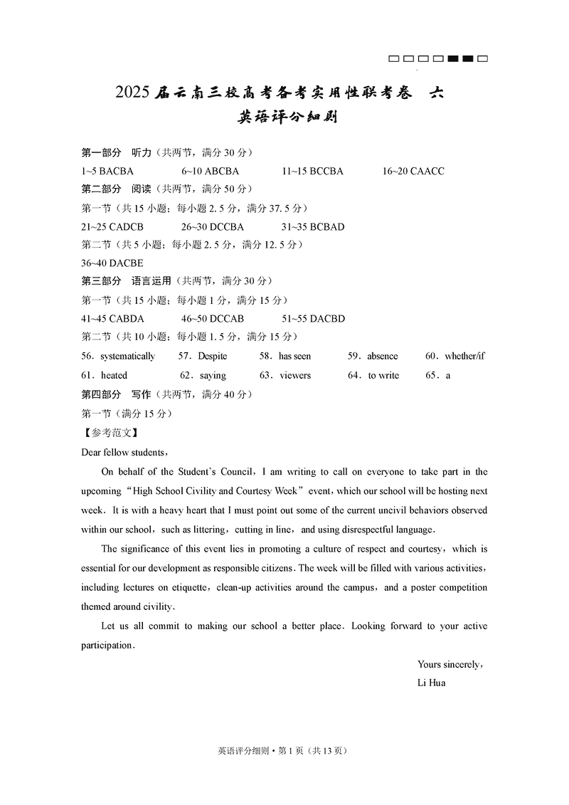 云南省三校2025届高三下高考备考实用性联考卷(六)英语考试已于近日开考,为方便考生考后及时查看考试情况,查漏补缺、弥补不足,本文整理了试题答案解析相关信息!