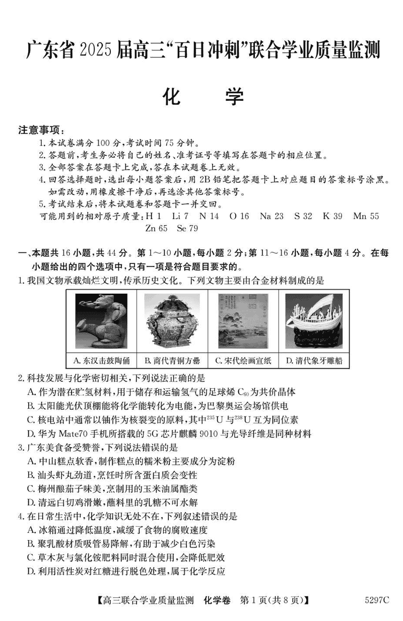 广东省2025届高三"百日冲刺"联合学业质量监测化学考试已于近日开考,为方便考生考后及时查看考试情况,查漏补缺、弥补不足,本文整理了试题答案解析相关信息!