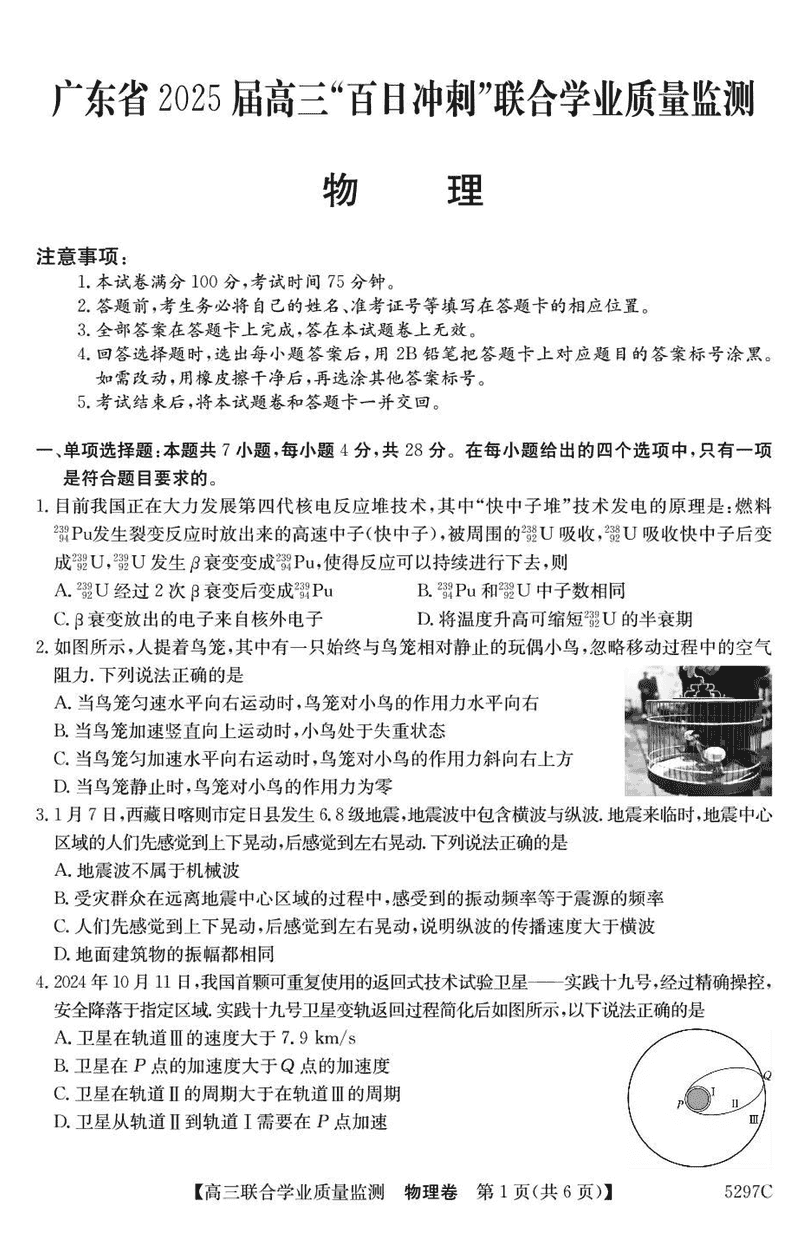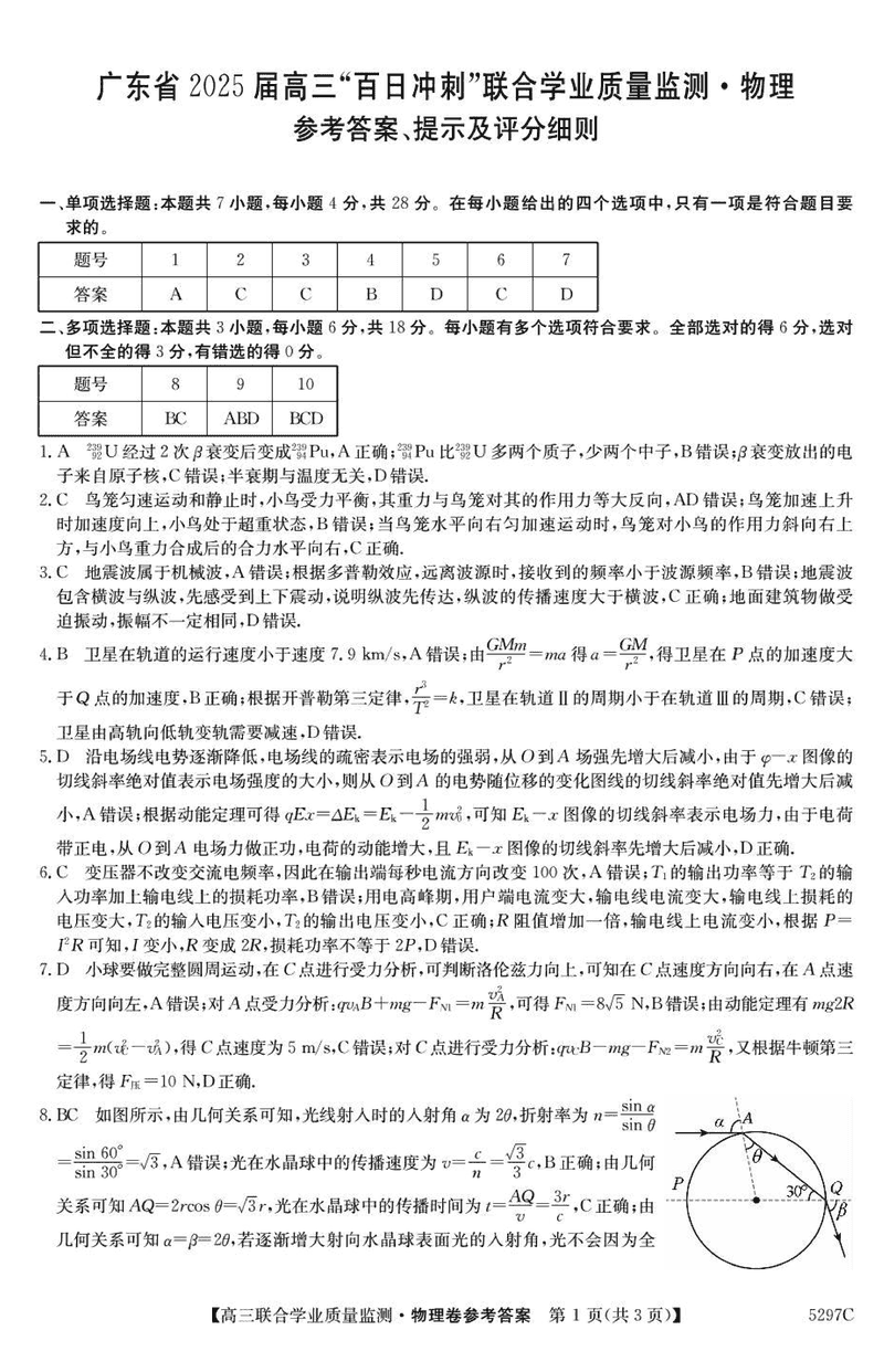 广东省2025届高三"百日冲刺"联合学业质量监测物理考试已于近日开考,为方便考生考后及时查看考试情况,查漏补缺、弥补不足,本文整理了试题答案解析相关信息!