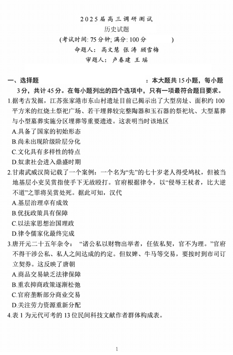 江苏泰州2025届高三下学期开学调研历史试题及答案 时间:2025-02-23 江苏 文综试题 江苏泰州2025届高三下学期开学调研历史考试已于近日开考,为方便考生考后及时查看考试情况,查漏补缺、弥补不足,本文整理了试题答案解析相关信息! 汇总:江苏泰州2025届高三下学期开学调研试题及答案汇总 历史试题及答案解析