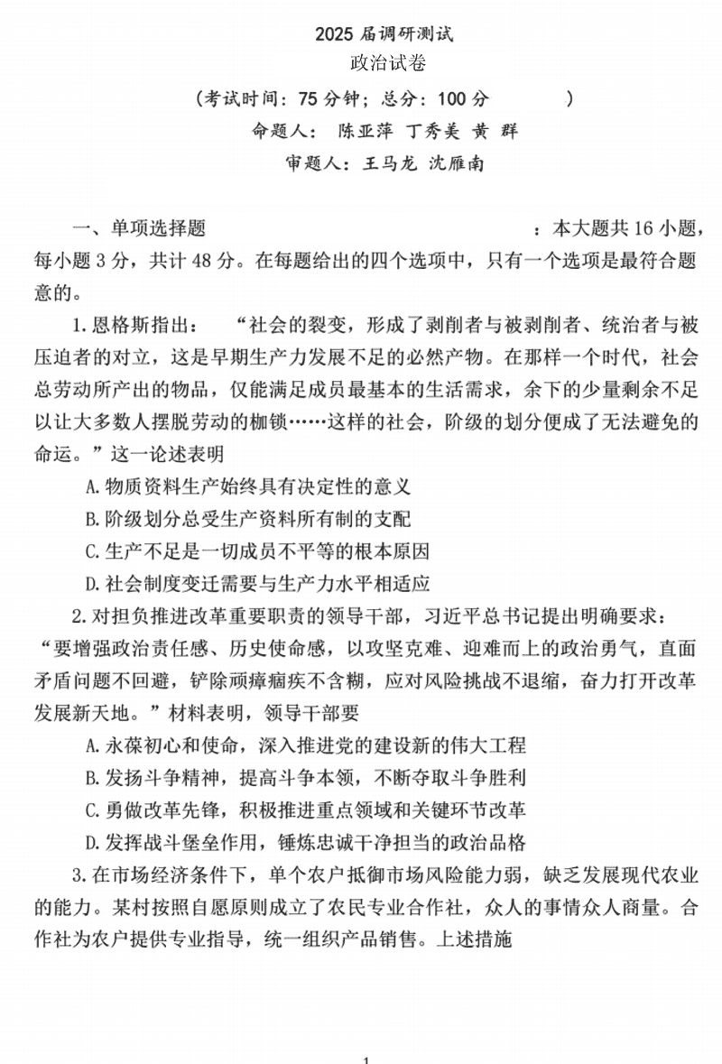 江苏泰州2025届高三下学期开学调研政治试题及答案 时间:2025-02-23 江苏 文综试题 江苏泰州2025届高三下学期开学调研政治考试已于近日开考,为方便考生考后及时查看考试情况,查漏补缺、弥补不足,本文整理了试题答案解析相关信息! 汇总:江苏泰州2025届高三下学期开学调研试题及答案汇总 政治试题及答案解析