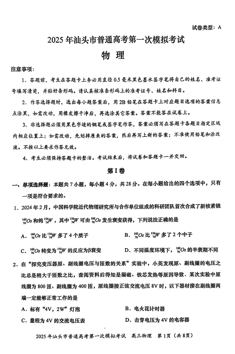 汕头一模2025届高三下学期第一次模拟考物理考试已于近日开考,为方便考生考后及时查看考试情况,查漏补缺、弥补不足,本文整理了试题答案解析相关信息!