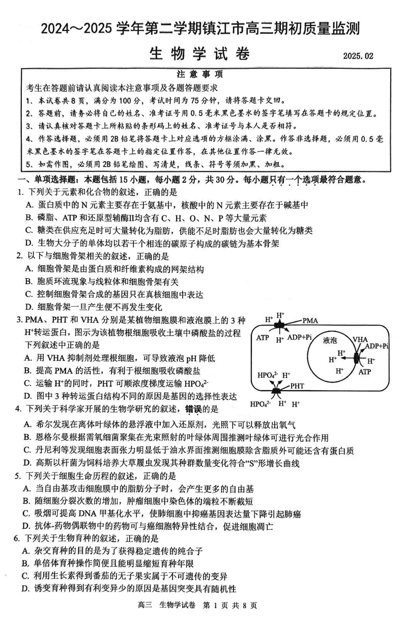 江苏镇江2024-2025学年高三下学期期初质量监测生物试题及答案