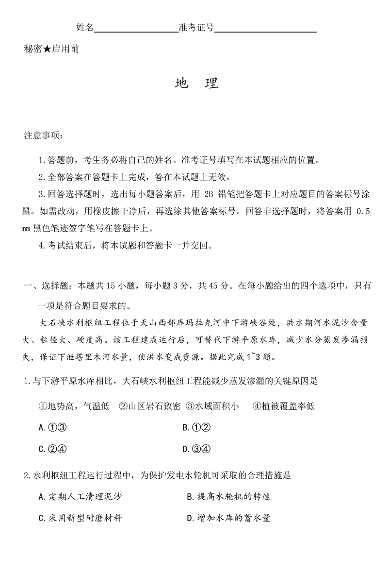 山西一模2025届高三下考前适应性测试启航卷地理试题及答案