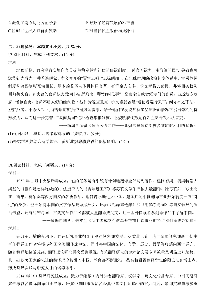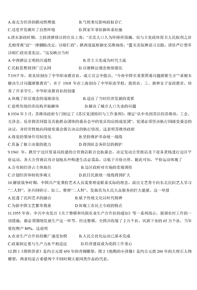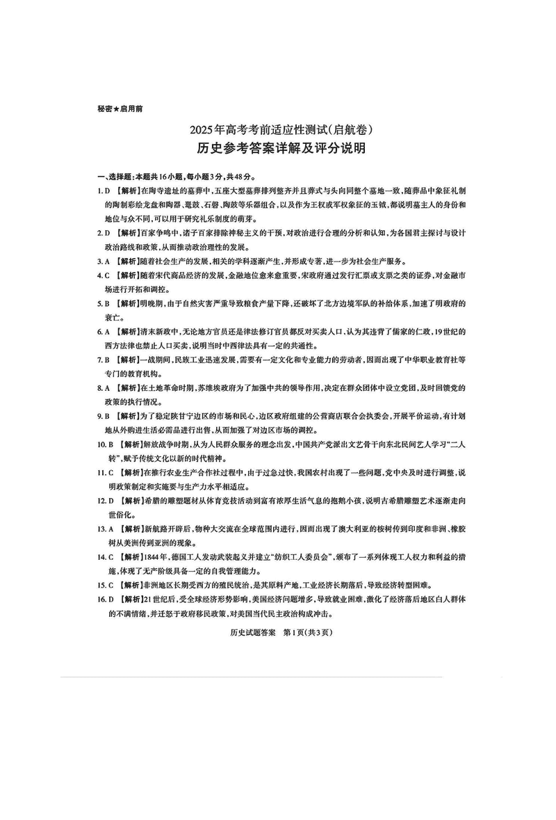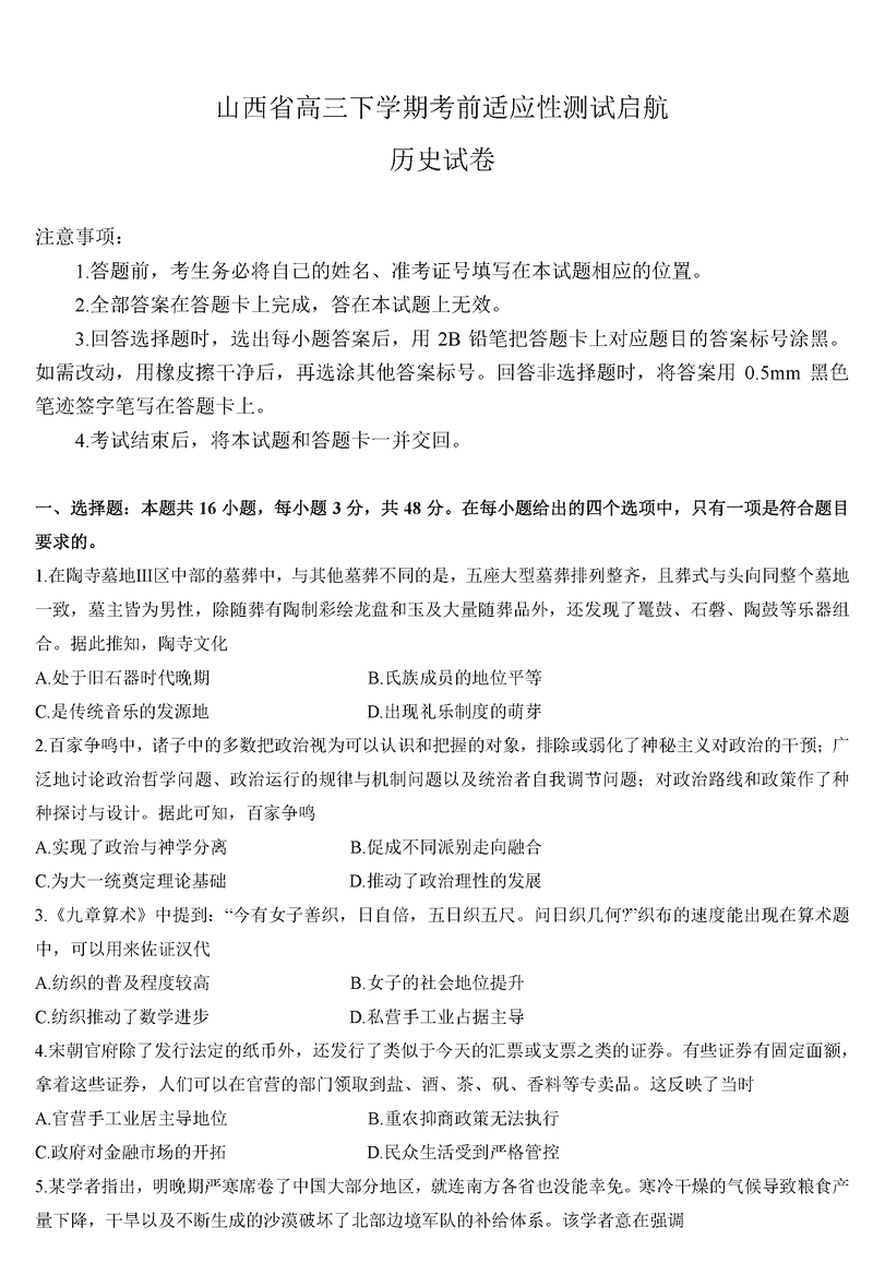 山西一模2025届高三下考前适应性测试启航卷历史试题及答案