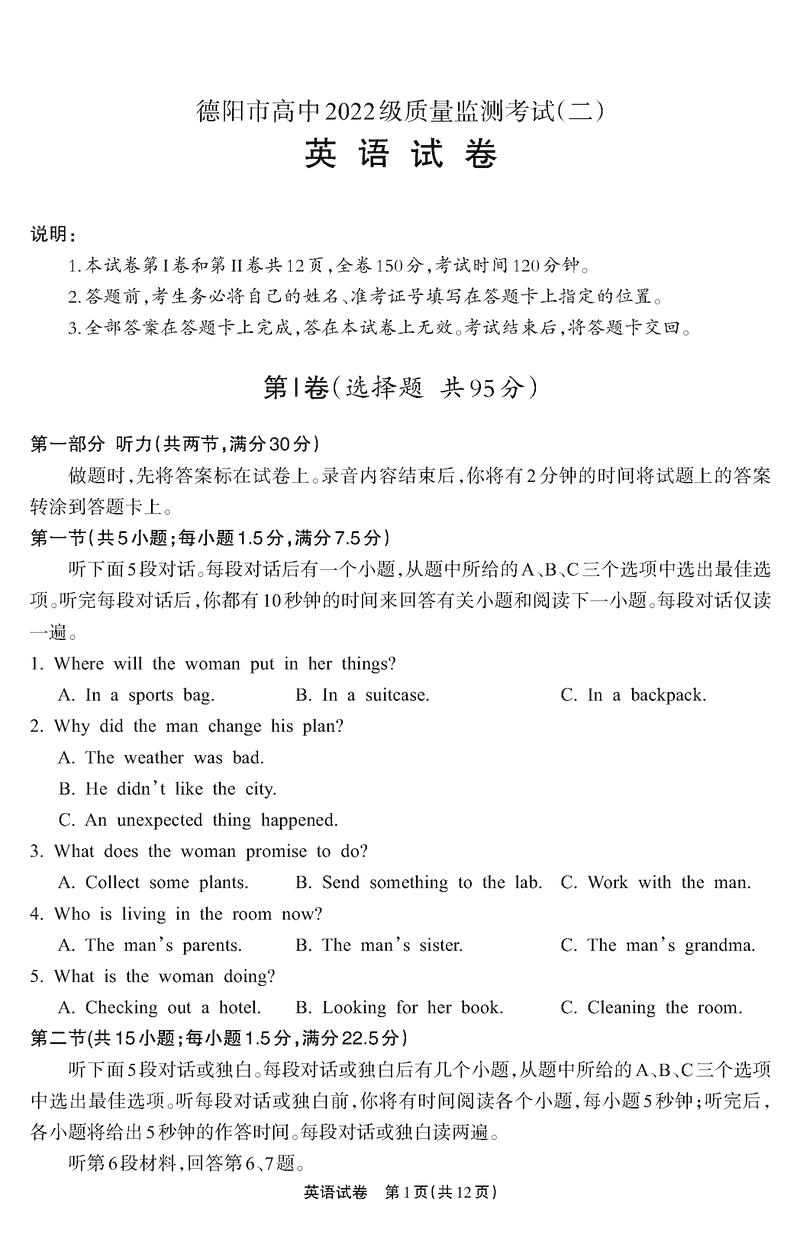 四川德阳高中2025届质量监测考试(二)英语考试已于近日开考,为方便考生考后及时查看考试情况,查漏补缺、弥补不足,本文整理了试题答案解析相关信息!