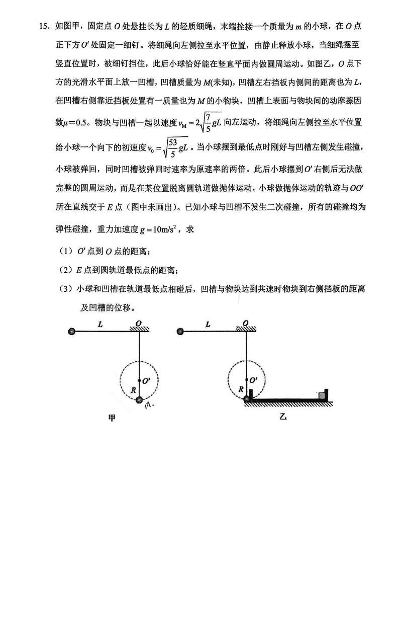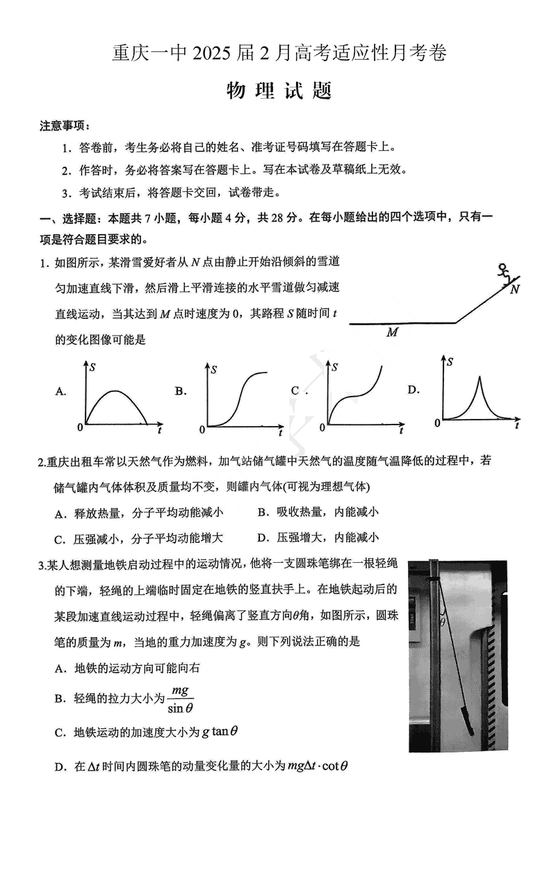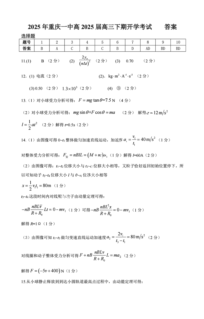 重庆一中2025届高三下学期2月开学考物理试题及答案