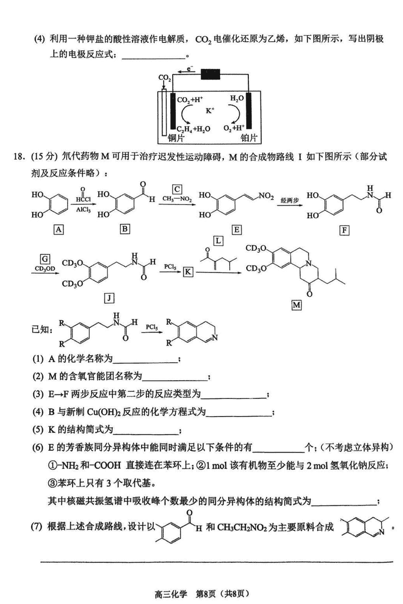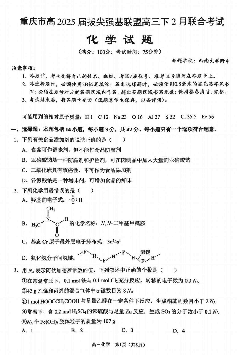 重庆拔尖强基联盟2025届高三下2月联考化学试题及答案