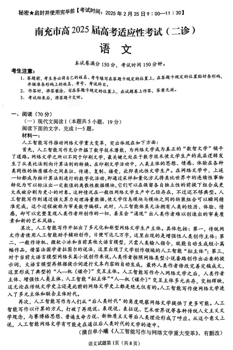 南充市高2025届高考适应性考试(二诊)语文试题及答案
