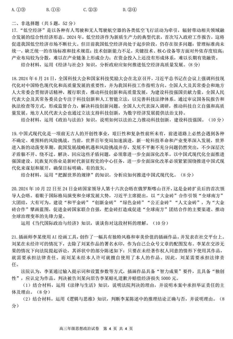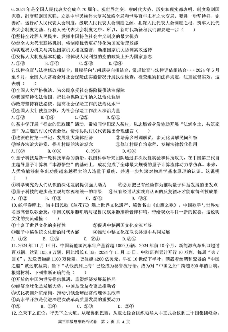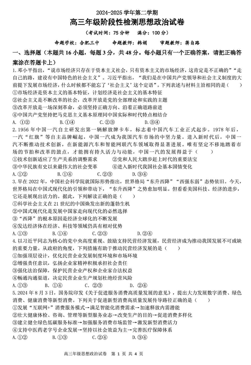 合肥市六校联盟2024-2025学年高三下学期阶段性检测政治试题及答案