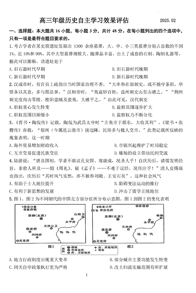 扬州中学2024-2025学年高三下学期2月阶段月考历史试题及答案