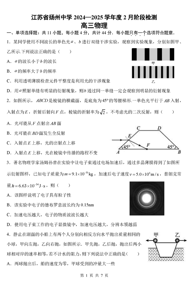 扬州中学2024-2025学年高三下学期2月阶段月考物理考试已于近日开考,为方便考生考后及时查看考试情况,查漏补缺、弥补不足,本文整理了试题答案解析相关信息!