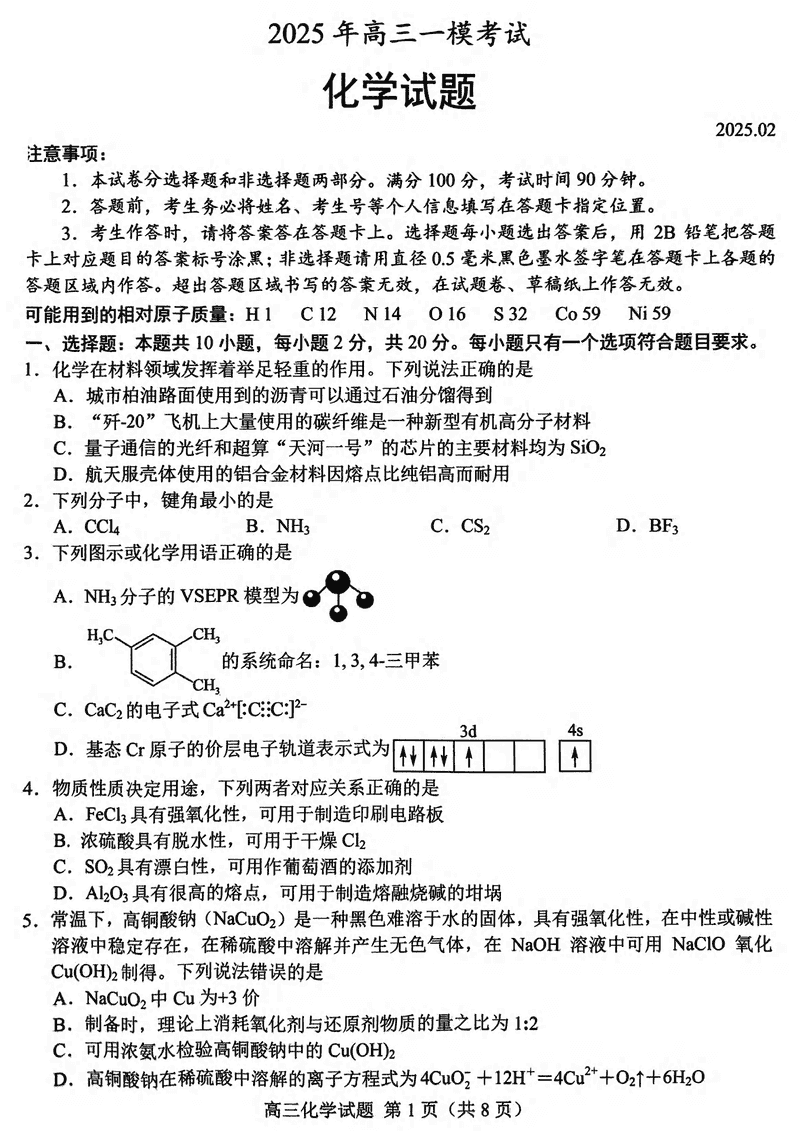 山东菏泽2025年高三一模化学试题及答案 时间:2025-02-27 山东 理综试题 山东菏泽2025年高三一模化学考试已于近日开考,为方便考生考后及时查看考试情况,查漏补缺、弥补不足,本文整理了试题答案解析相关信息! 汇总:山东菏泽2025年高三一模考试试题及答案汇总 化学试题及答案解析