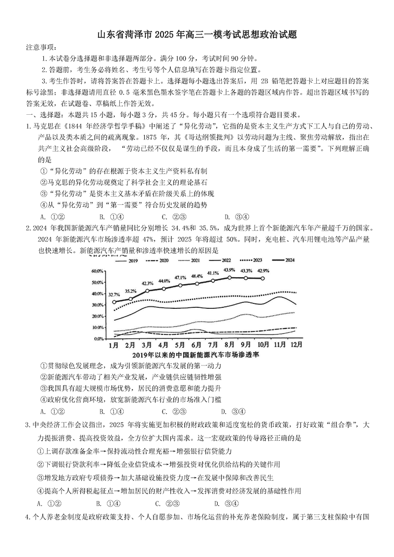 山东菏泽2025年高三一模政治试题及答案 时间:2025-02-27 山东 文综试题 山东菏泽2025年高三一模政治考试已于近日开考,为方便考生考后及时查看考试情况,查漏补缺、弥补不足,本文整理了试题答案解析相关信息! 汇总:山东菏泽2025年高三一模考试试题及答案汇总 政治试题及答案解析