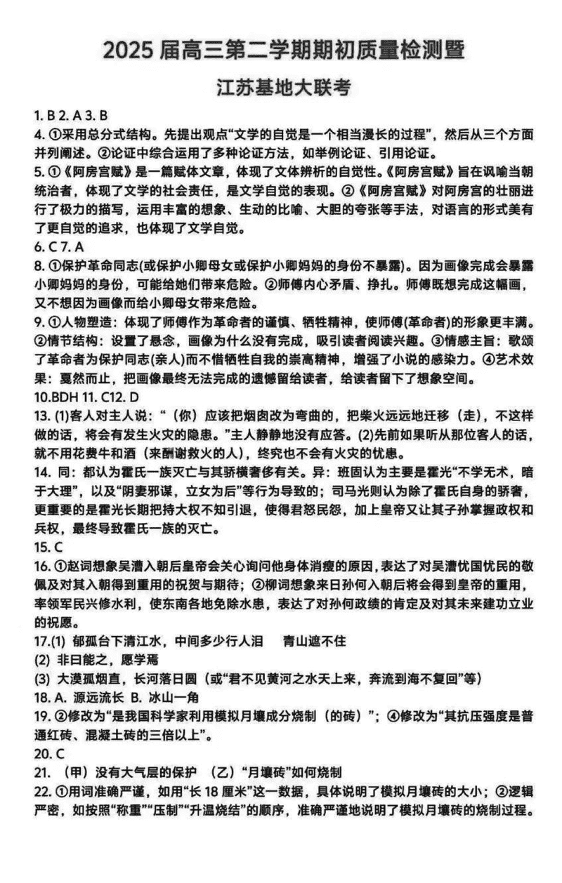 江苏省新高考基地学校2025届高三下学期期初质量监测语文考试已于近日开考,为方便考生考后及时查看考试情况,查漏补缺、弥补不足,本文整理了试题答案解析相关信息!