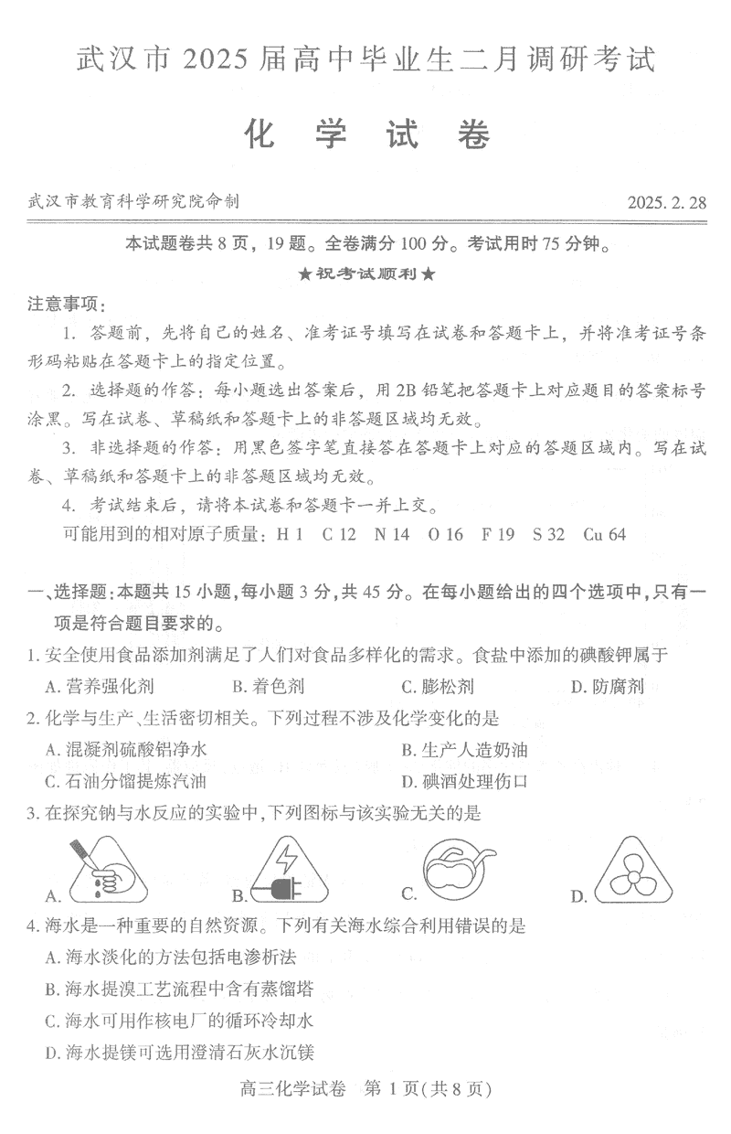 武汉市2025届高中毕业生二月调研化学试题及答案 时间:2025-03-01 湖北 理综试题 武汉市2025届高中毕业生二月调研化学考试已于近日开考,为方便考生考后及时查看考试情况,查漏补缺、弥补不足,本文整理了试题答案解析相关信息! 汇总:武汉市2025届高中毕业生二月调研考试试题及答案汇总 化学试题及答案解析