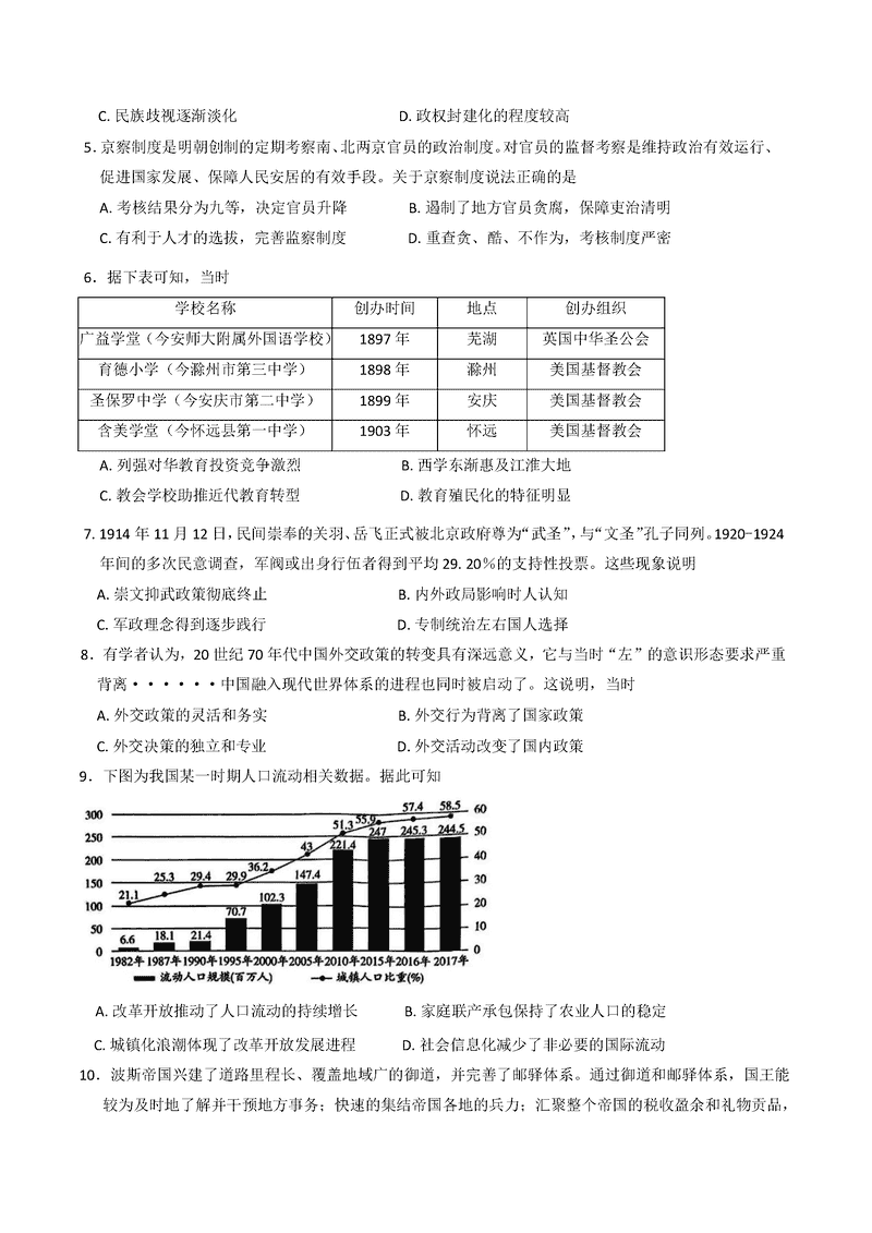 滁州市2025届高三下学期第一次教学质量监测历史试题及答案