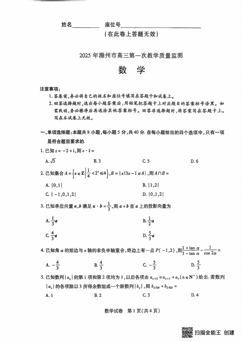 滁州市2025届高三下学期第一次教学质量监测数学试题及答案