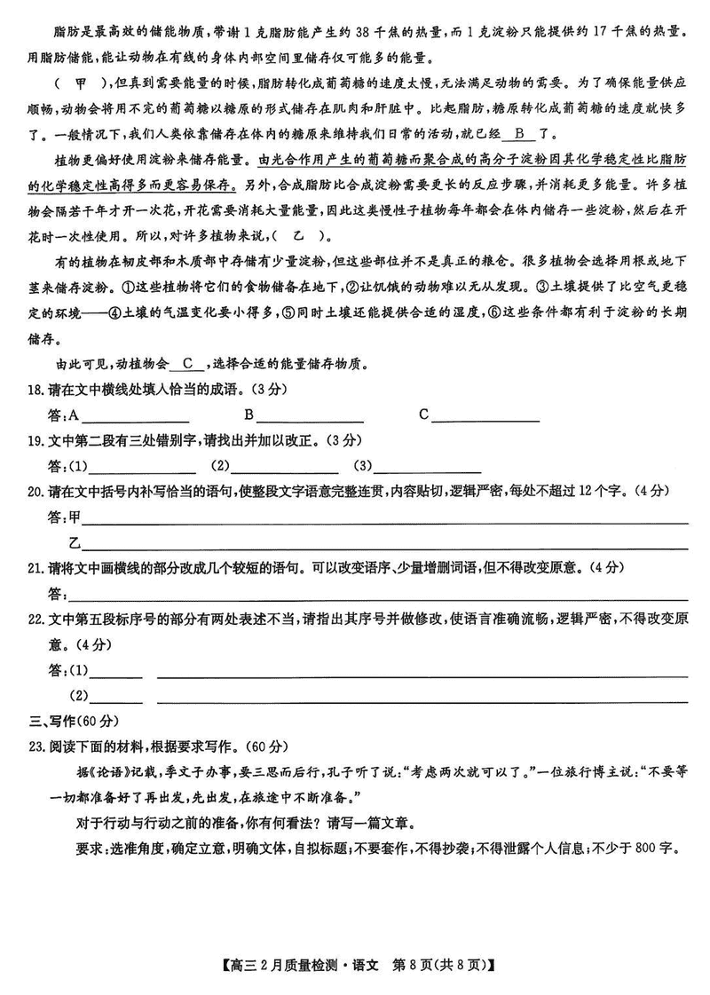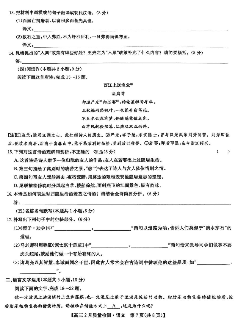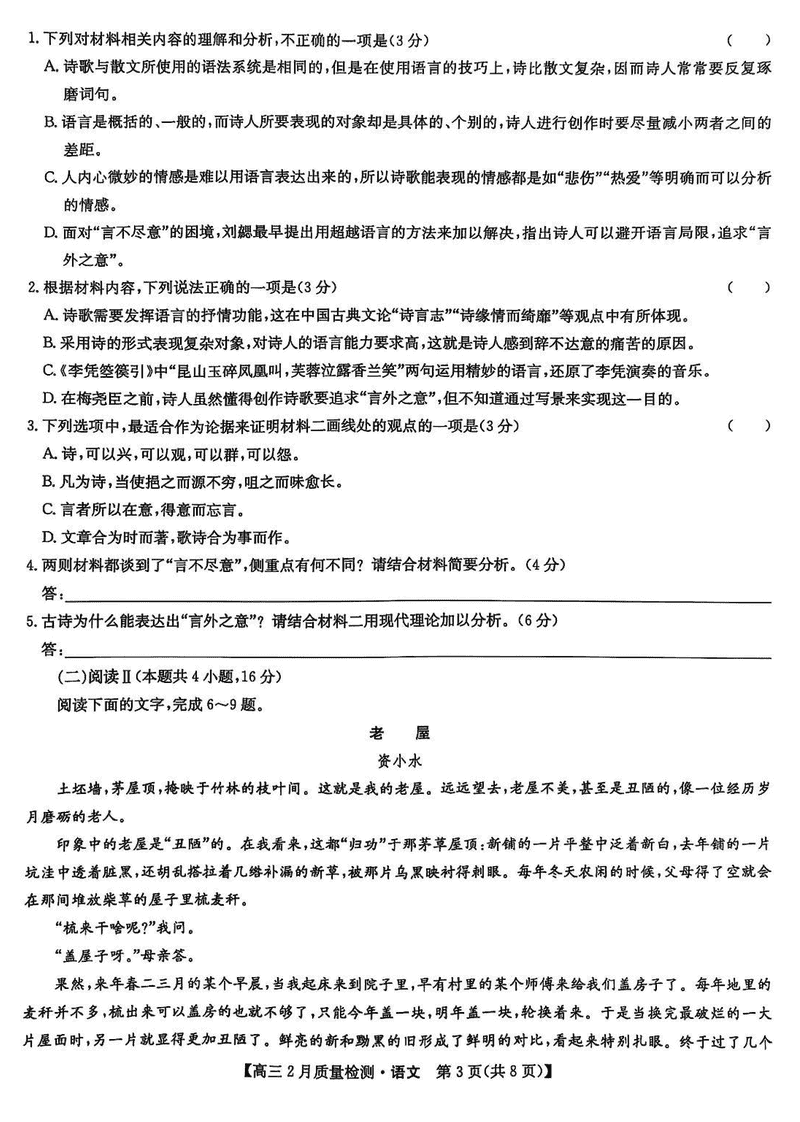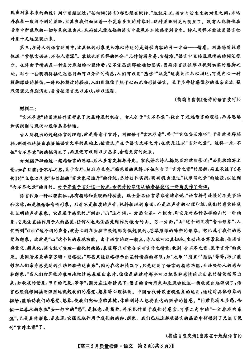 九师联盟2025届高三2月质量检测语文试题及答案 时间:2025-03-01 语文试题 九师联盟2025届高三2月质量检测语文考试已于近日开考,为方便考生考后及时查看考试情况,查漏补缺、弥补不足,本文整理了试题答案解析相关信息! 汇总:九师联盟2025届高三2月质量检测试题及答案汇总 语文试题及答案解析