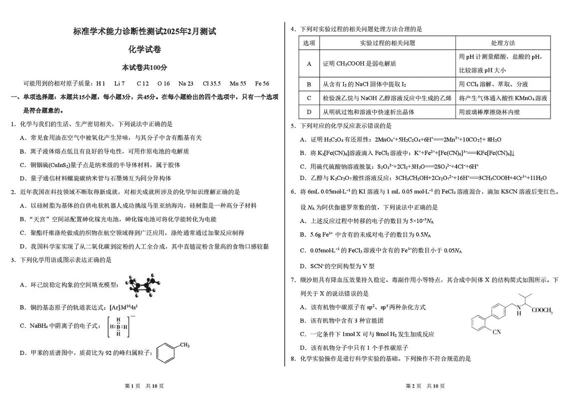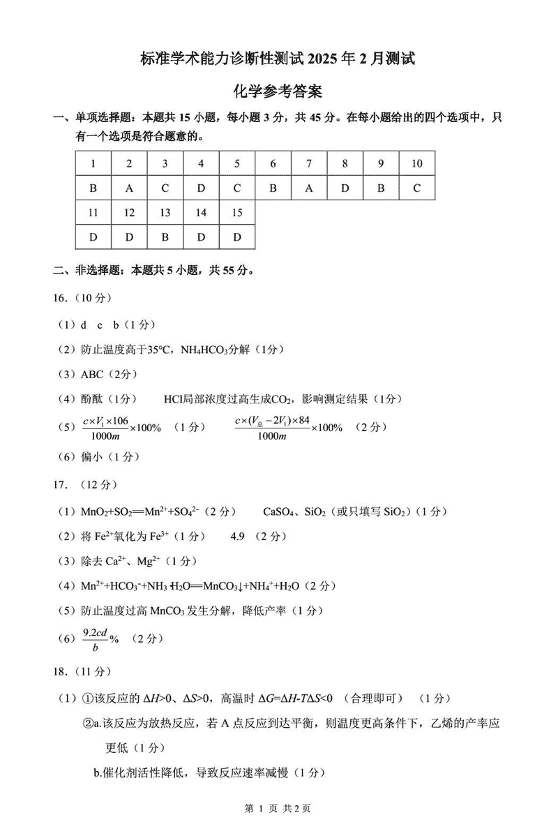 TDA2025年2月标准学术能力诊断性测试化学试题及答案