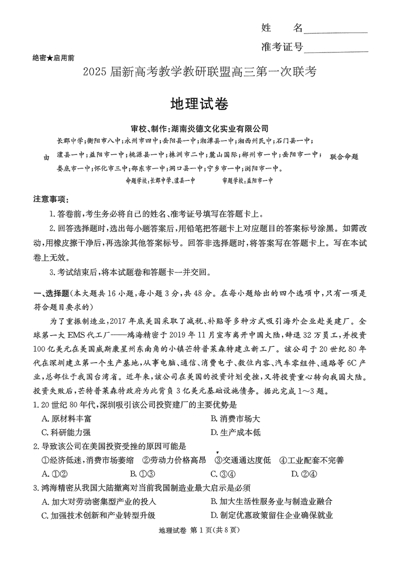 湖南省新高考教学教研联盟2025届第一次联考地理考试已于近日开考,为方便考生考后及时查看考试情况,查漏补缺、弥补不足,本文整理了试题答案解析相关信息!